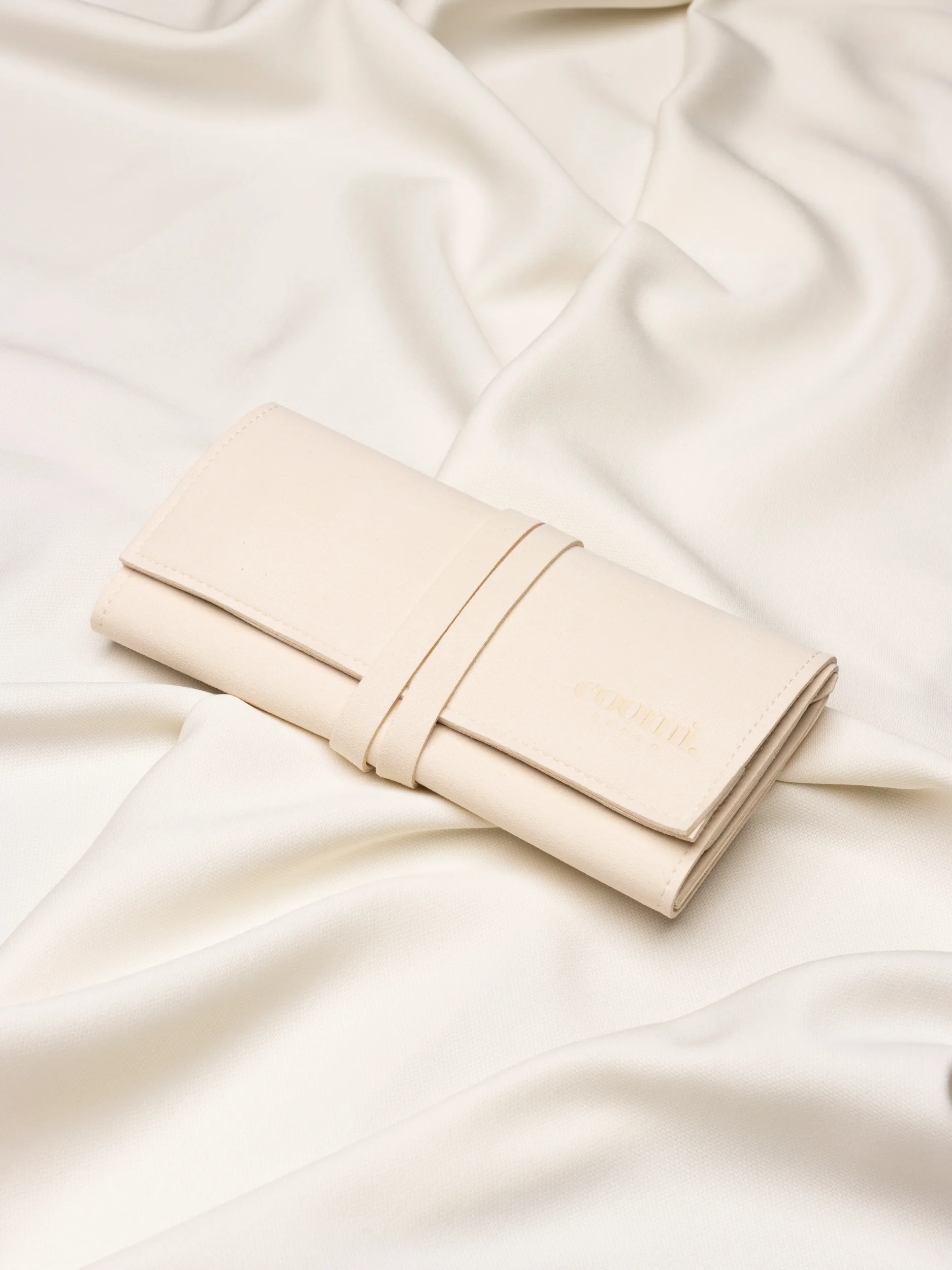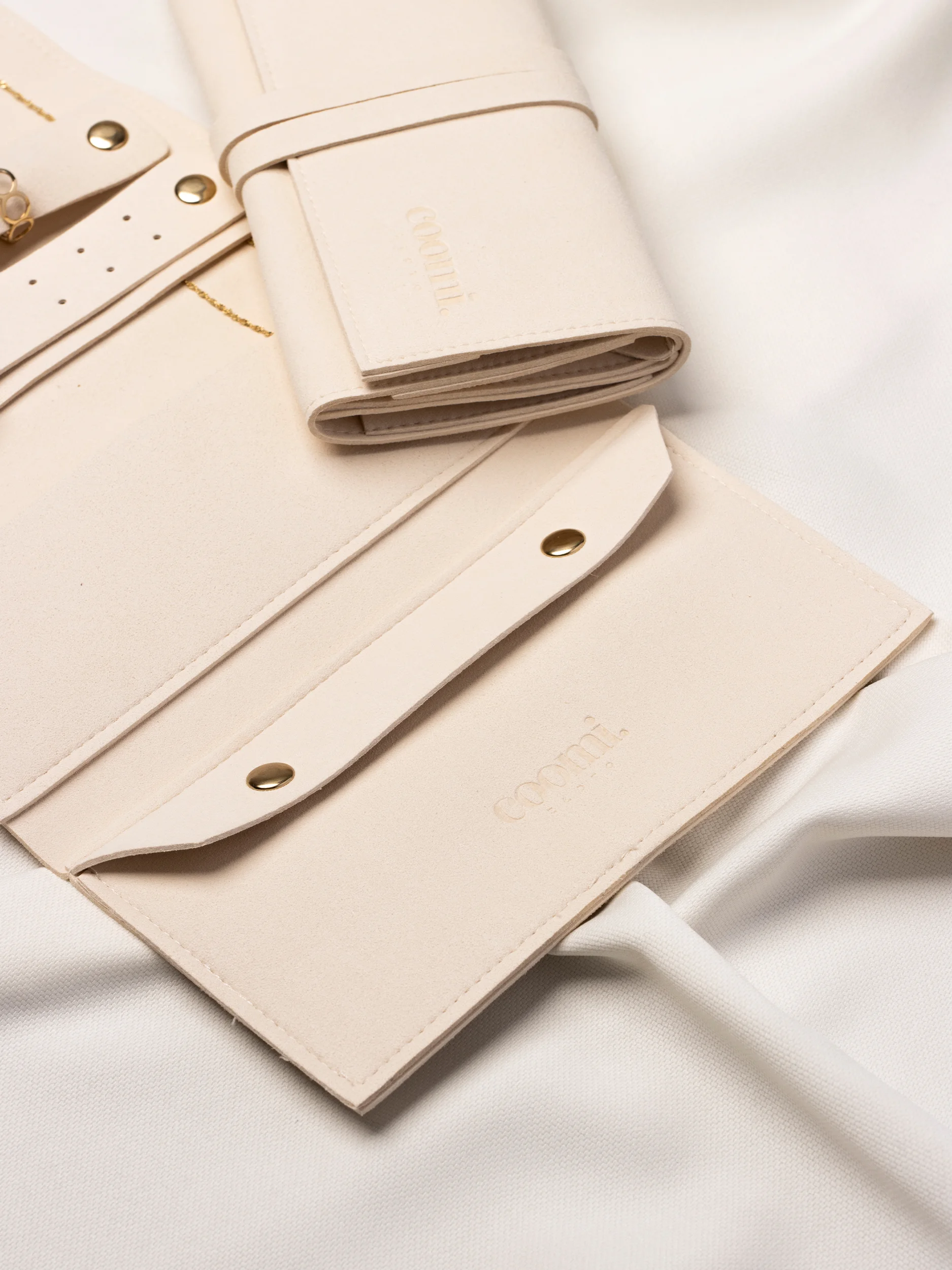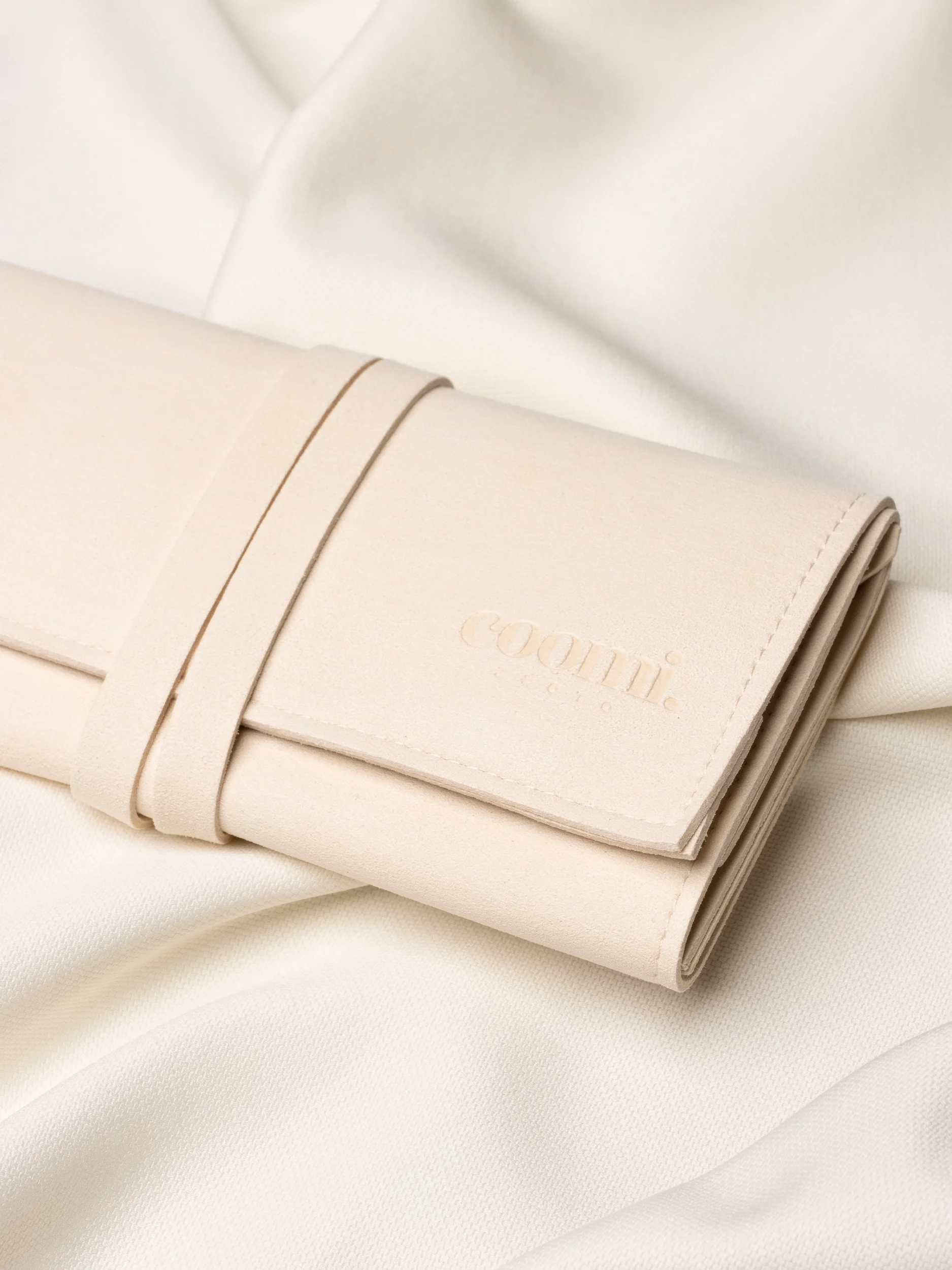 Kompaktowe, zwijane etui podróżne na biżuterię marki Coomi. Wykonane z jasnego, miękkiego materiału o strukturze zamszu, który ma za zadanie chronić powierzchnię biżuterii przed zarysowaniami podczas transportu. Zamykane za pomocą paska. Wnętrze wyposażono w funkcjonalne organizery zapinane na napy – w tym dedykowane paski z otworami na kolczyki, uchwyty na pierścionki, przestrzeń na łańcuszki i bransoletki oraz zamykaną kieszonkę na mniejszą biżuterię.