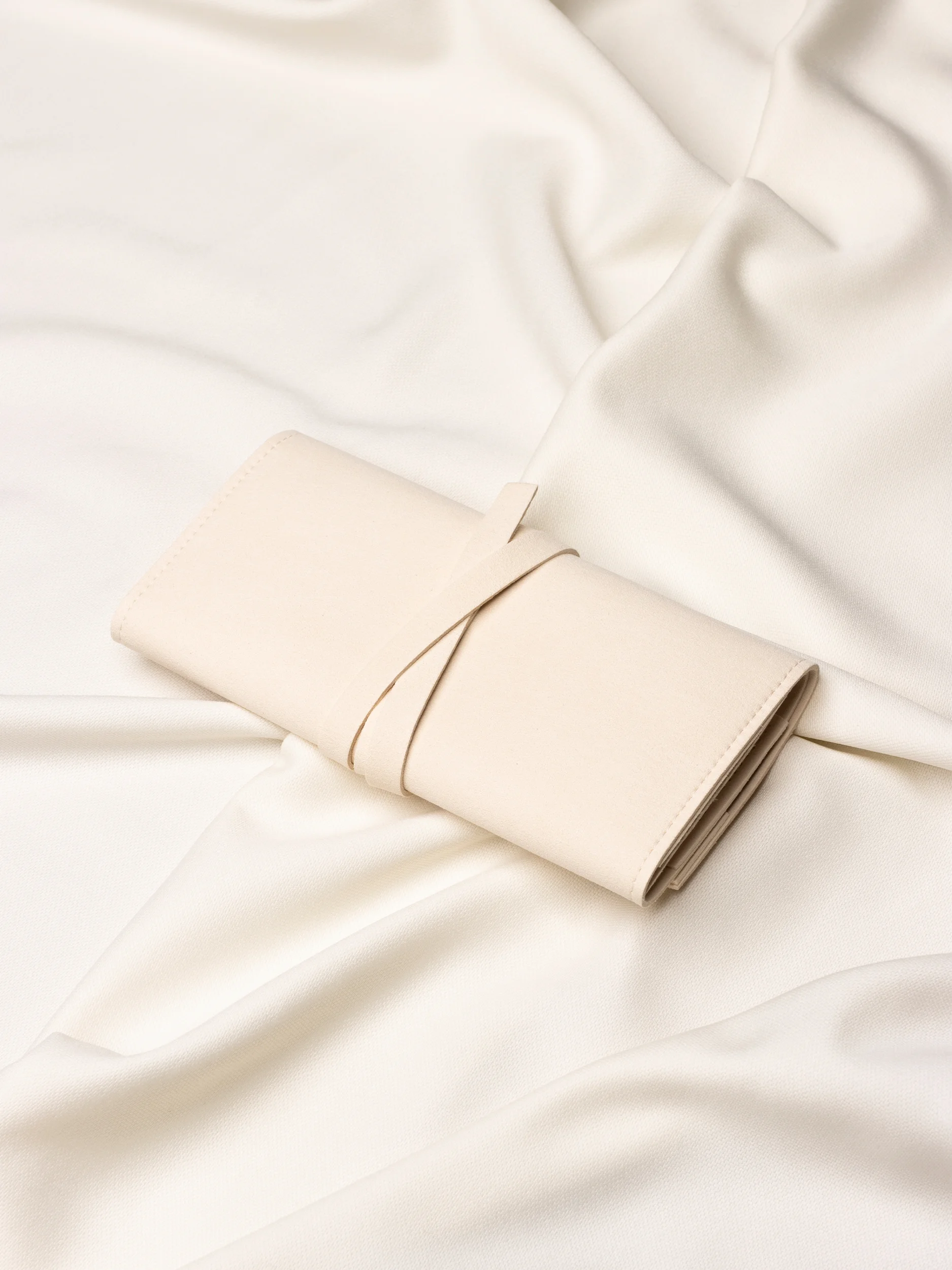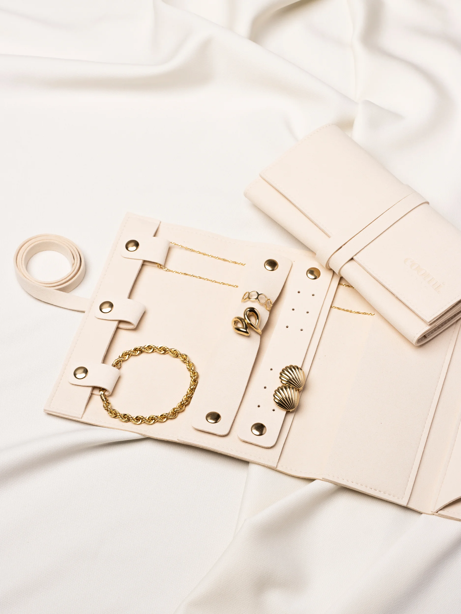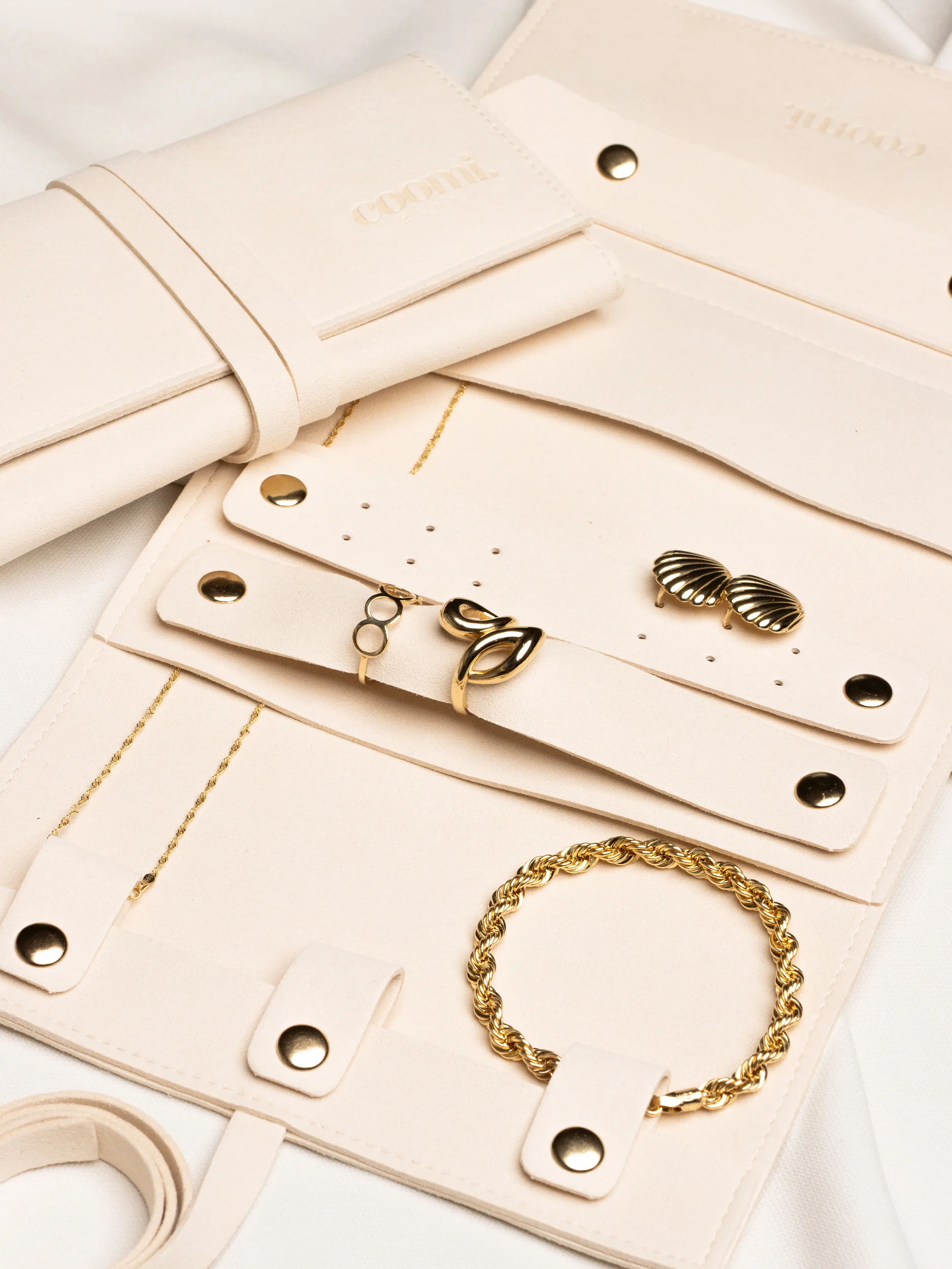 Kompaktowe, zwijane etui podróżne na biżuterię marki Coomi. Wykonane z jasnego, miękkiego materiału o strukturze zamszu, który ma za zadanie chronić powierzchnię biżuterii przed zarysowaniami podczas transportu. Zamykane za pomocą paska. Wnętrze wyposażono w funkcjonalne organizery zapinane na napy – w tym dedykowane paski z otworami na kolczyki, uchwyty na pierścionki, przestrzeń na łańcuszki i bransoletki oraz zamykaną kieszonkę na mniejszą biżuterię.