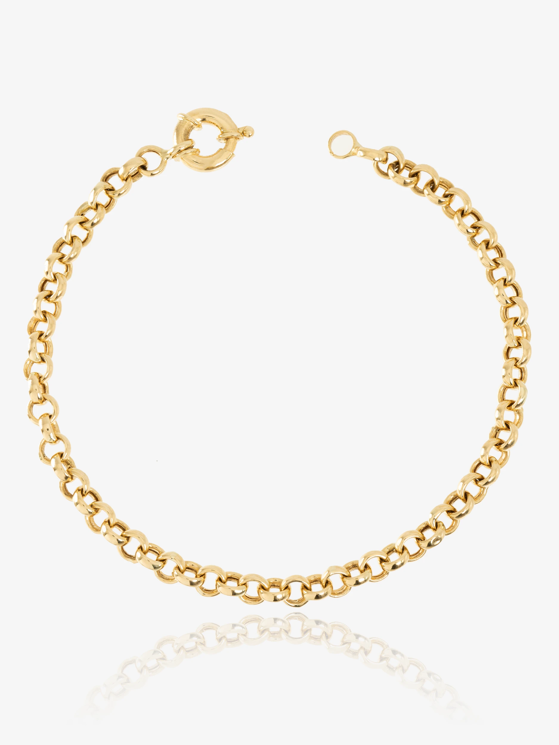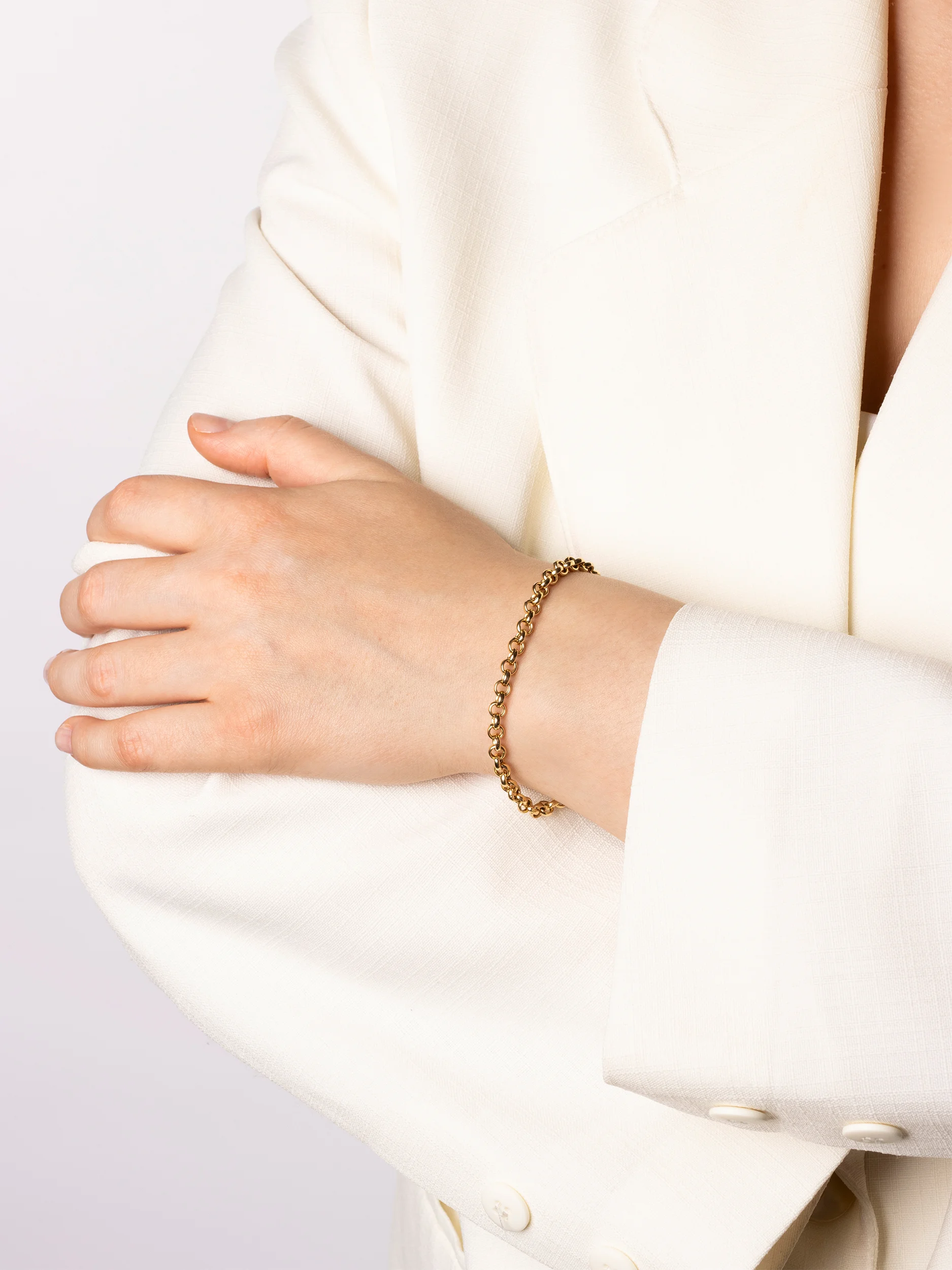 Złota bransoletka w modnym i popularnym splocie rolo. Doskonale sprawdzi się jako główny akcent stylizacji. Wykonana w całości ze złota próby 585. Dostępna w rozmiarze 19 cm.
