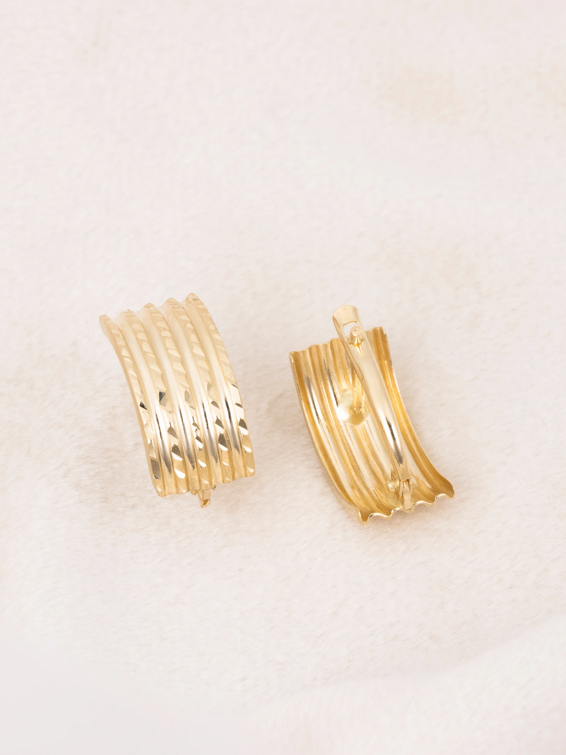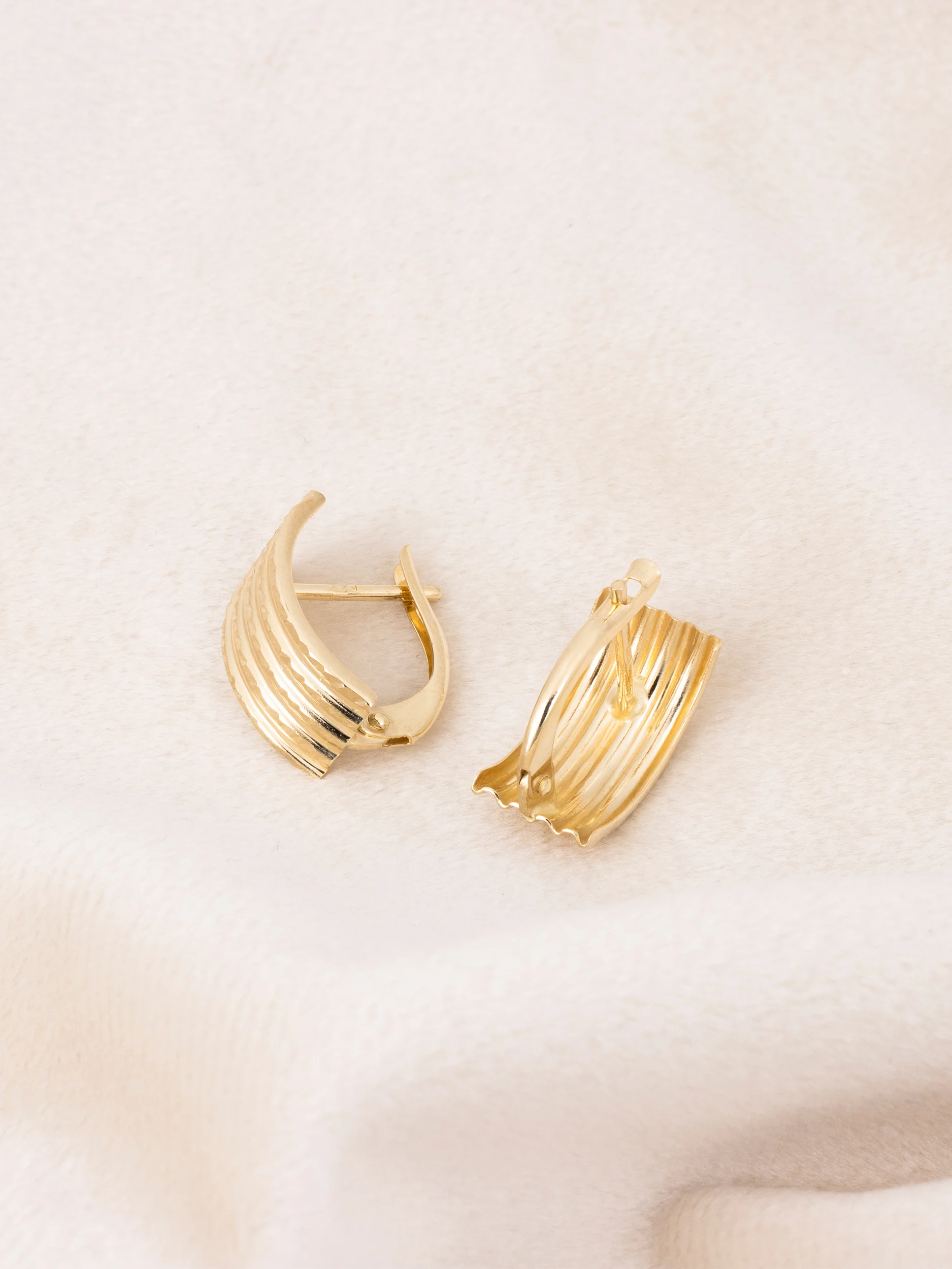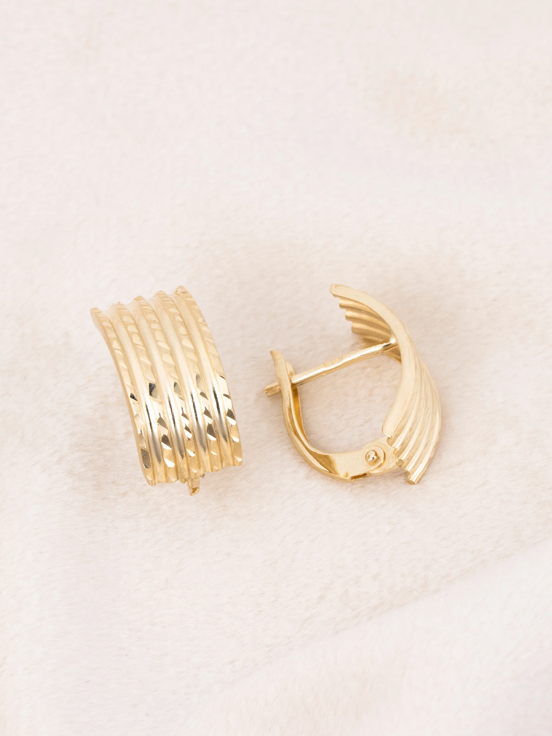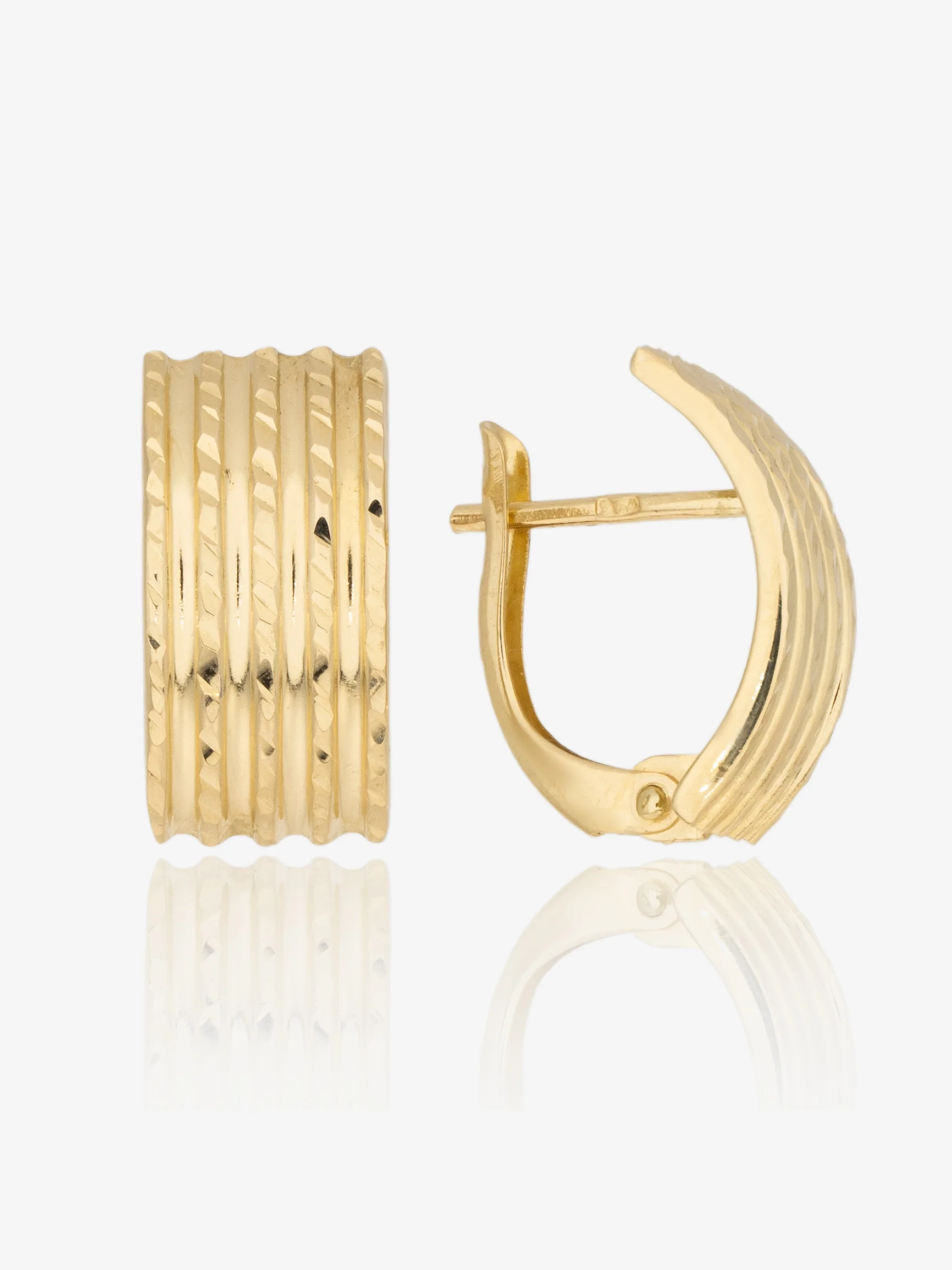 Złote kolczyki blaszki z pionowymi diamentowanymi liniami. Prosta forma z nowoczesnym wykończeniem. Wysokość blaszki to 16 mm a szerokość to 8 mm. Wykonane w całości z najwyższej jakości złota próby 585, zapinane na zapięcie angielskie.