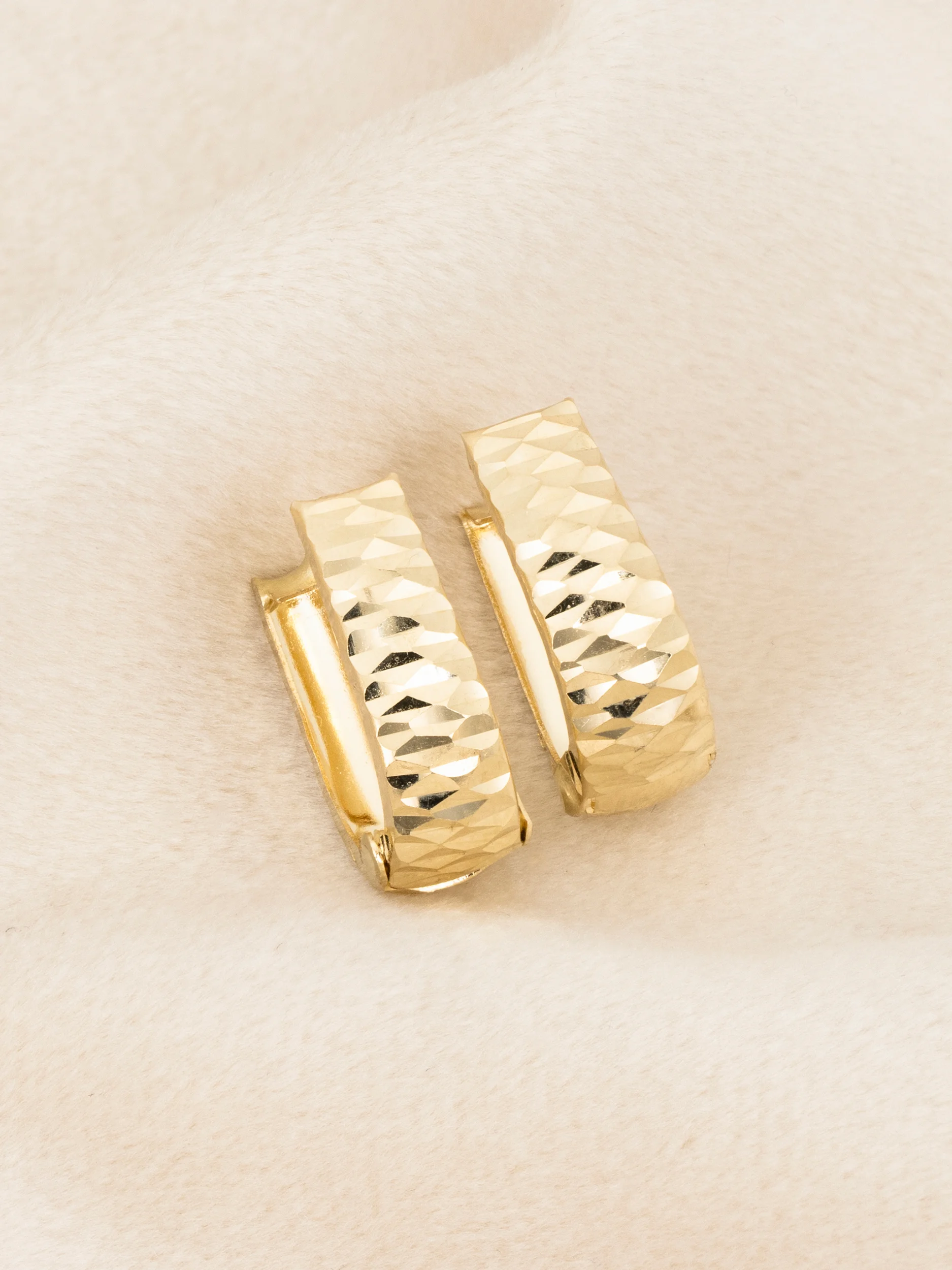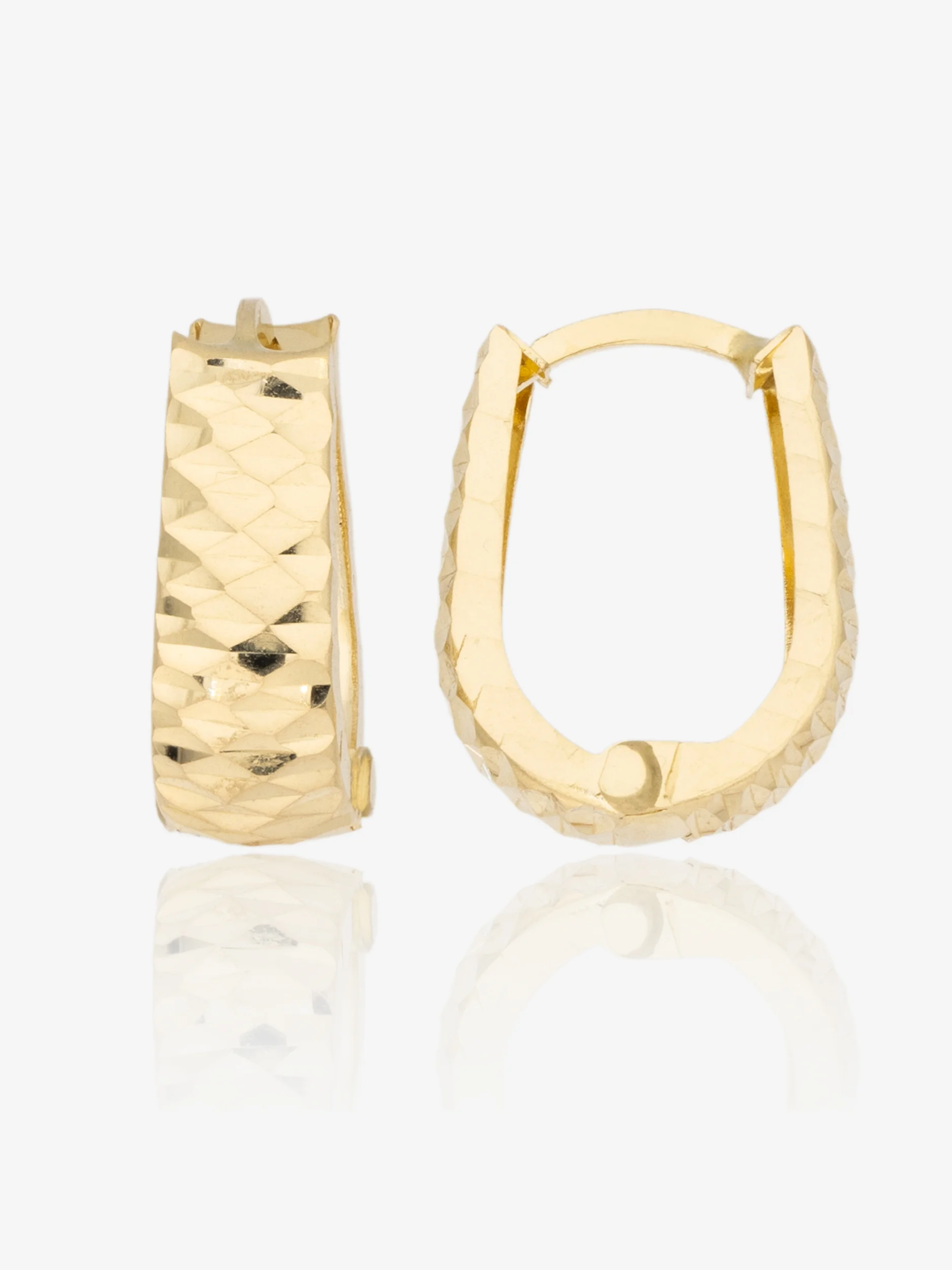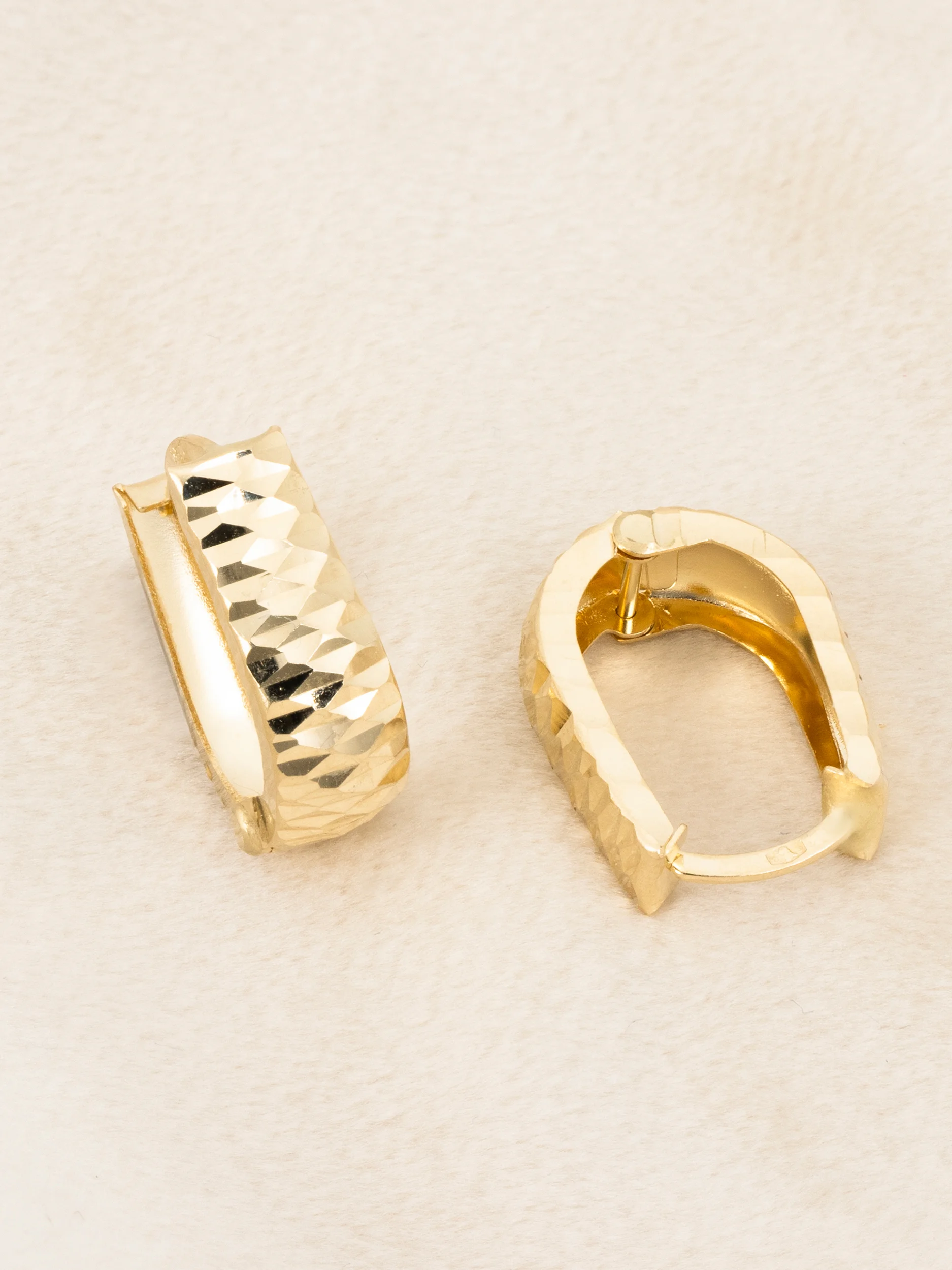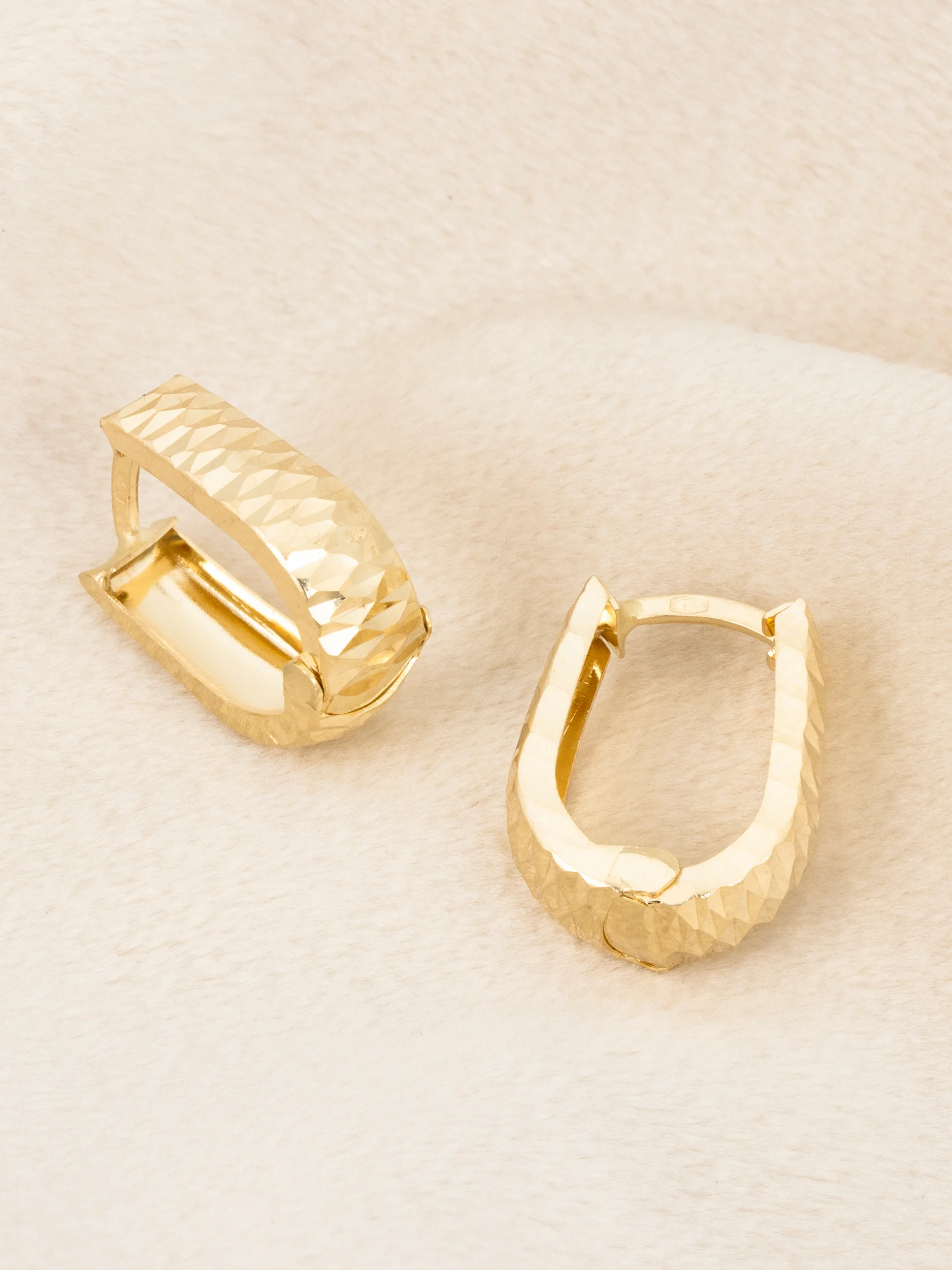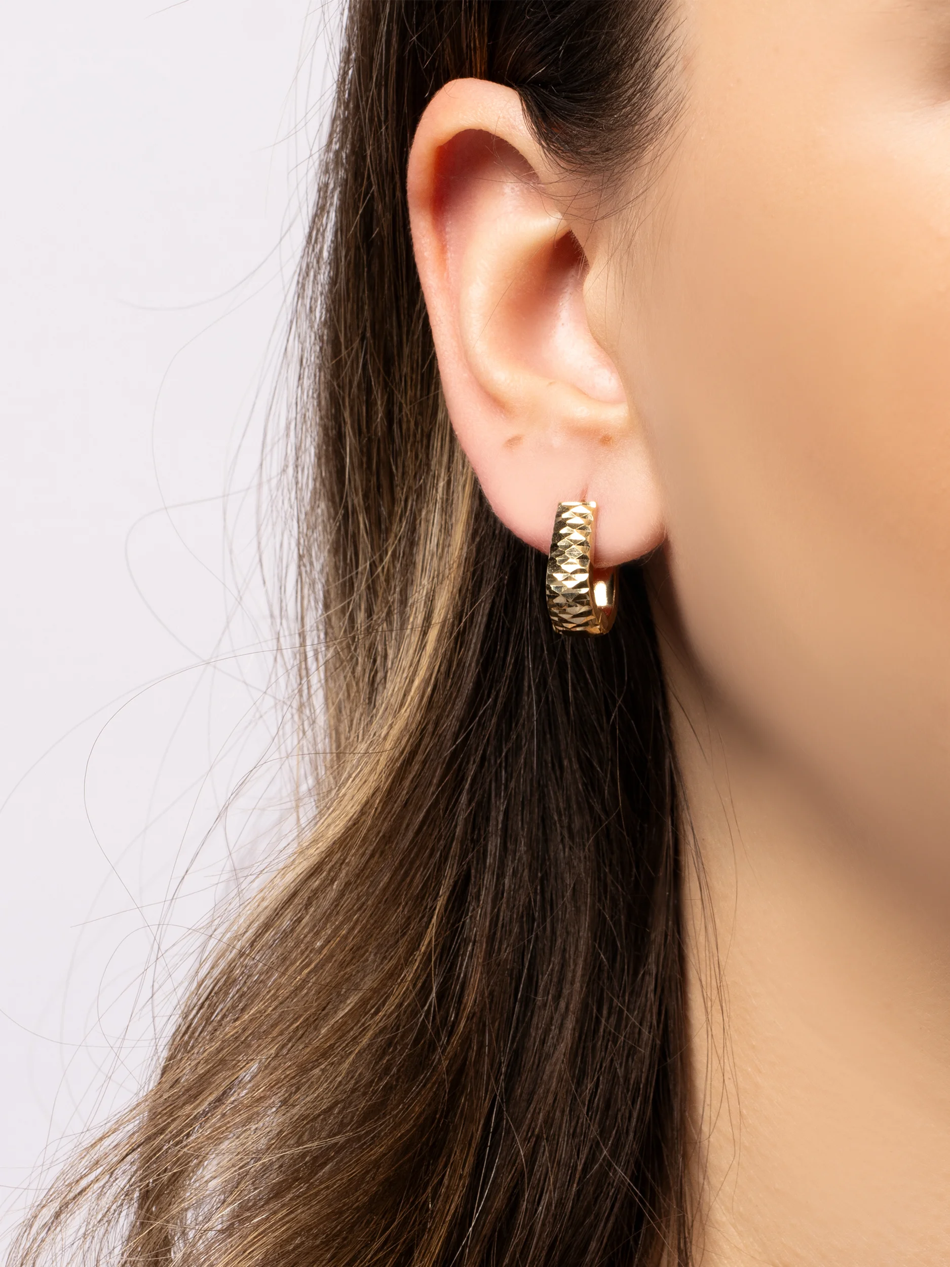 Złote kolczyki koła o wysokości 16 mm i szerokości 5,5 mm. Diamentowana faktura efektownie odbija światło rozświetlając twarz. Wykonane w całości ze złota próby 585, zapinane na zapięcie zatrzask pozostaną na swoim miejscu przez cały dzień.