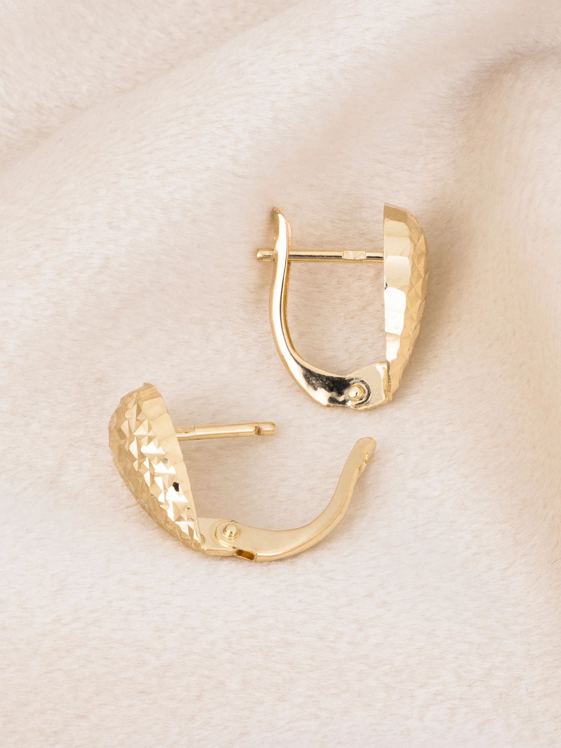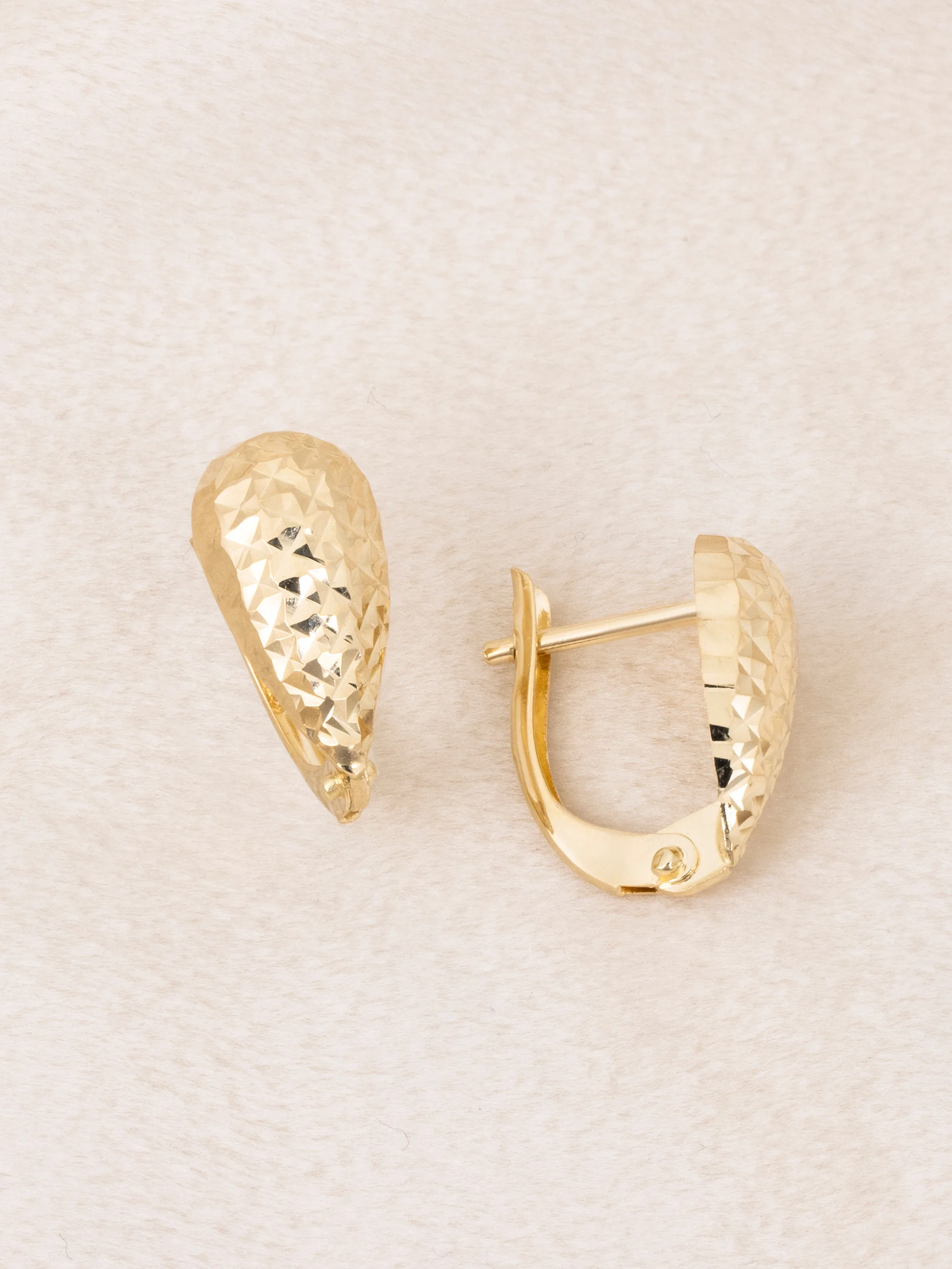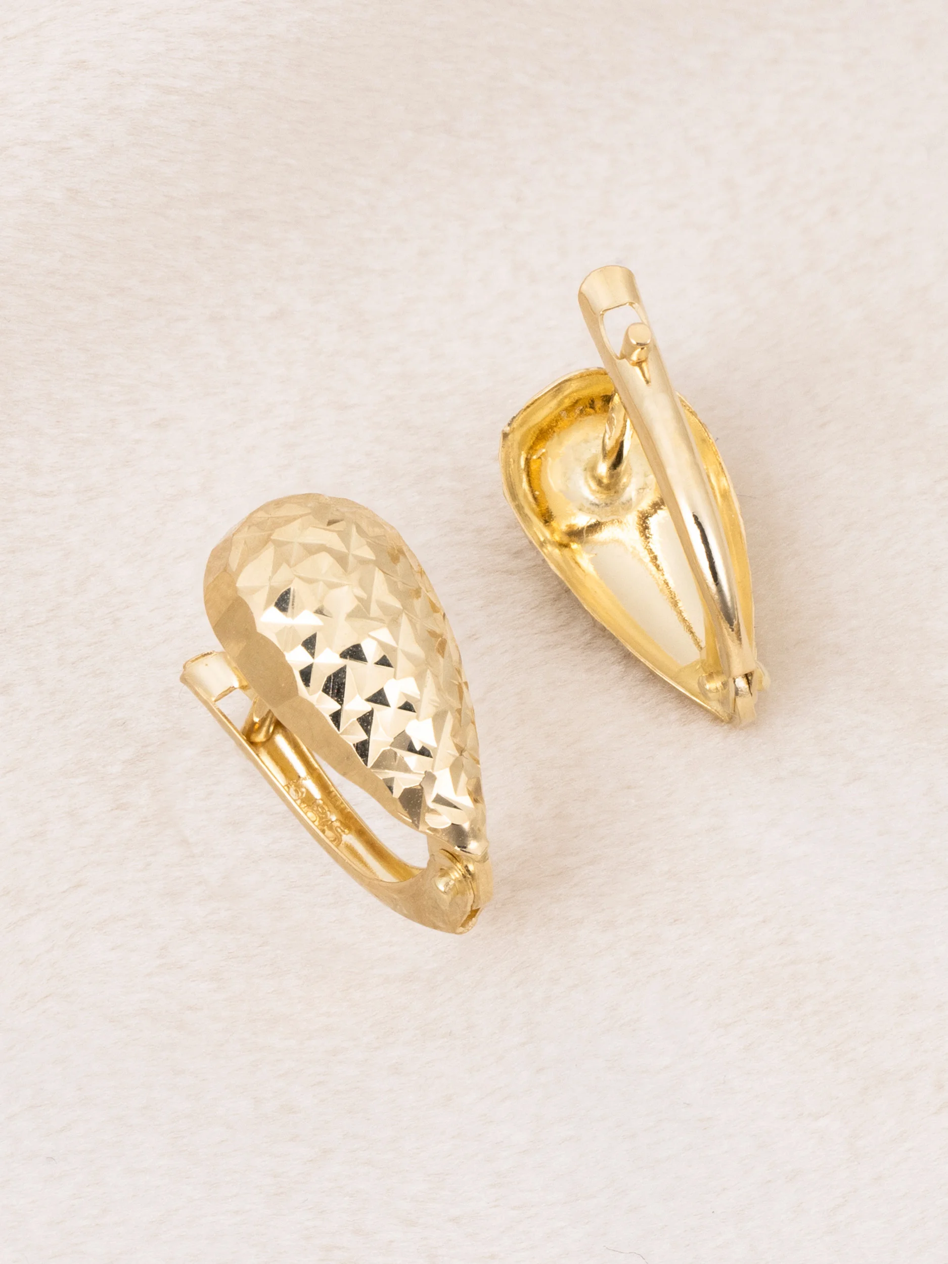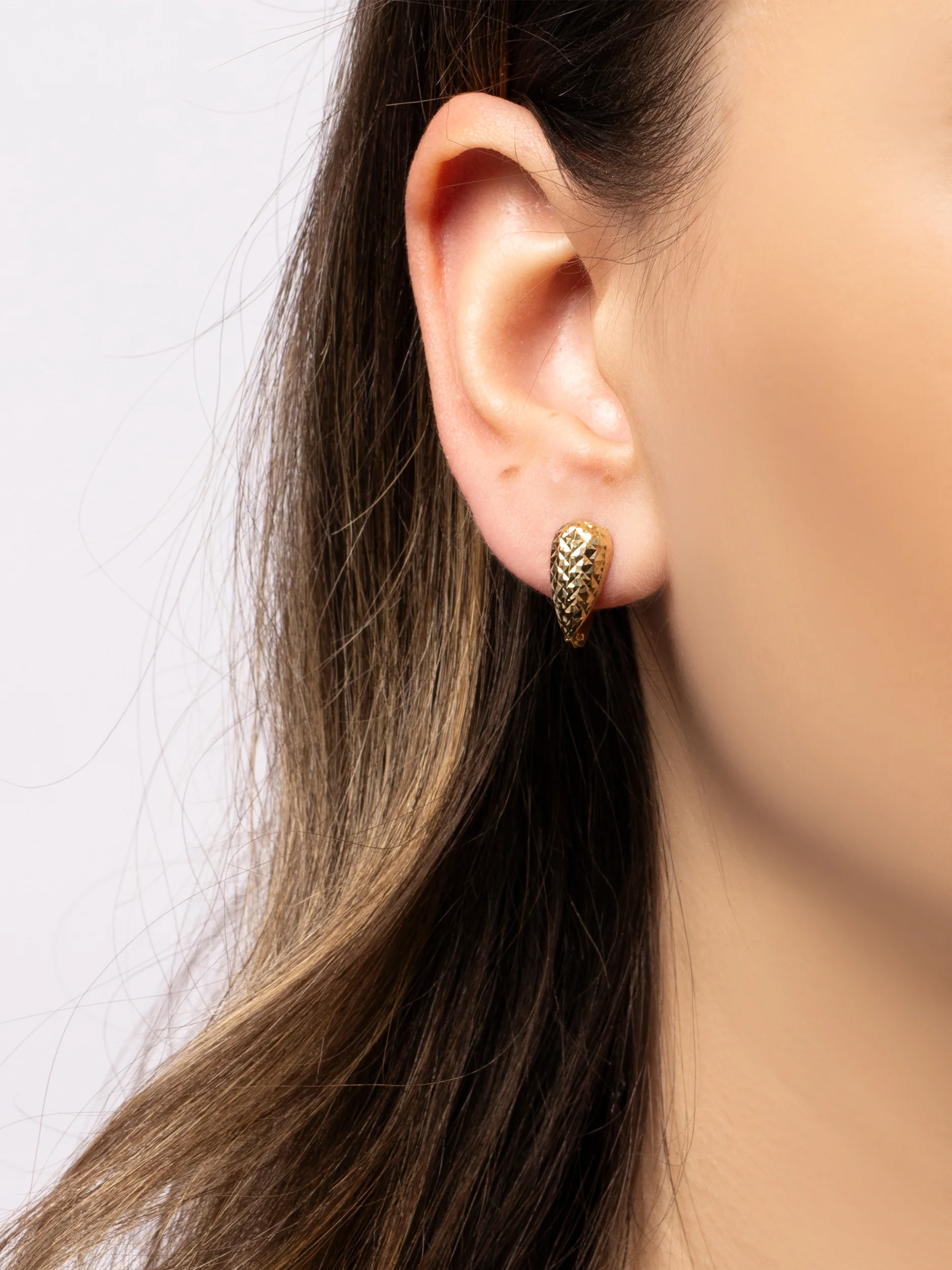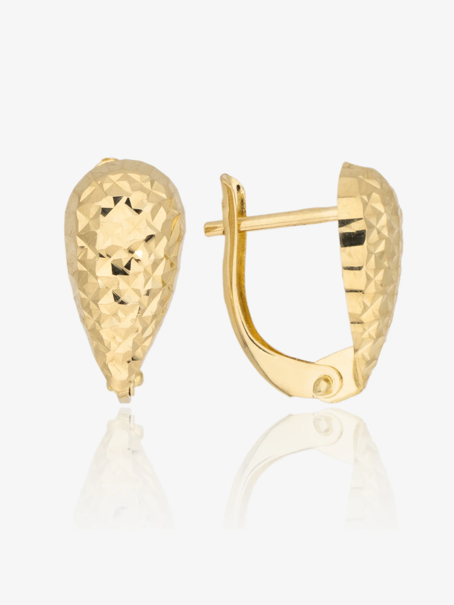 Złote kolczyki małe łezki o wysokości 15 mm i szerokości 7,5 mm. Diamentowana faktura efektownie odbija światło. Będą idealnym wyborem dla kobiet, które cenią efektownie błyszczące, lekkie dodatki na różne okazje. Wykonane w całości ze złota próby 585, zapinane na zapięcie angielskie pozostaną na swoim miejscu przez cały dzień.
