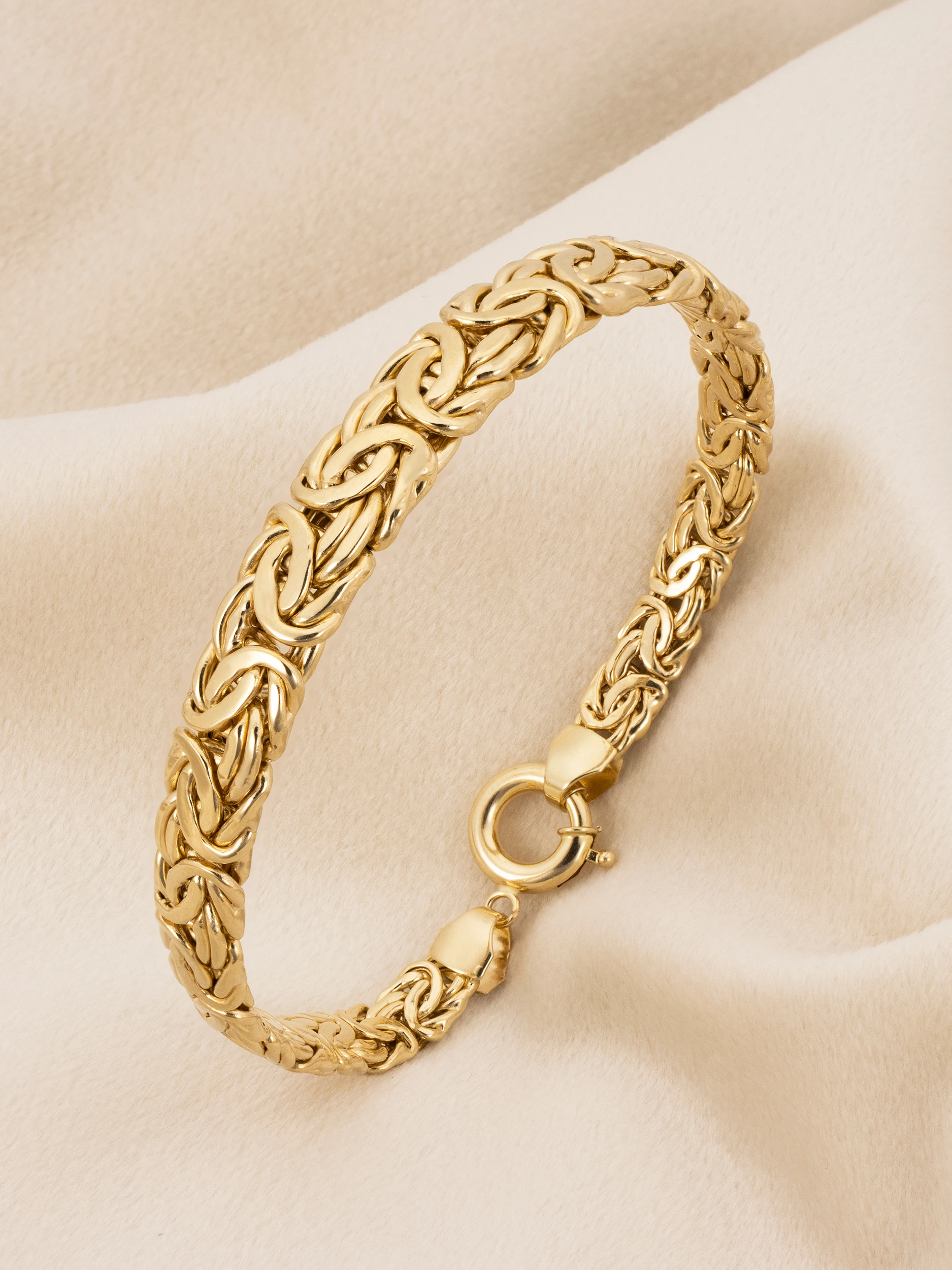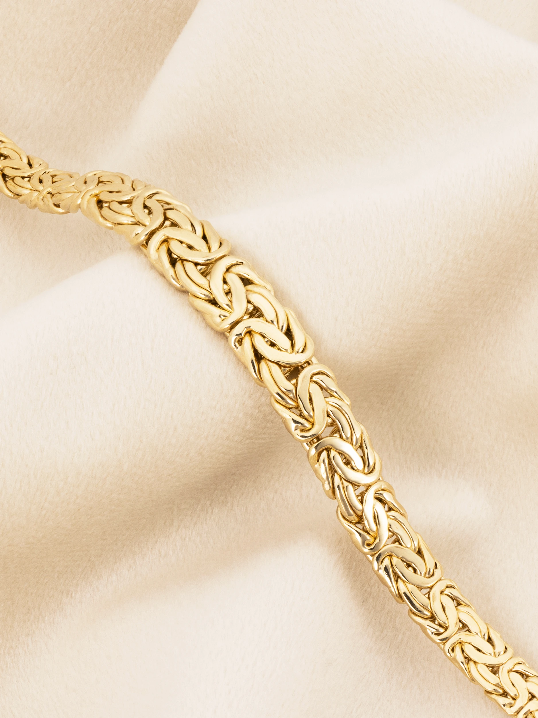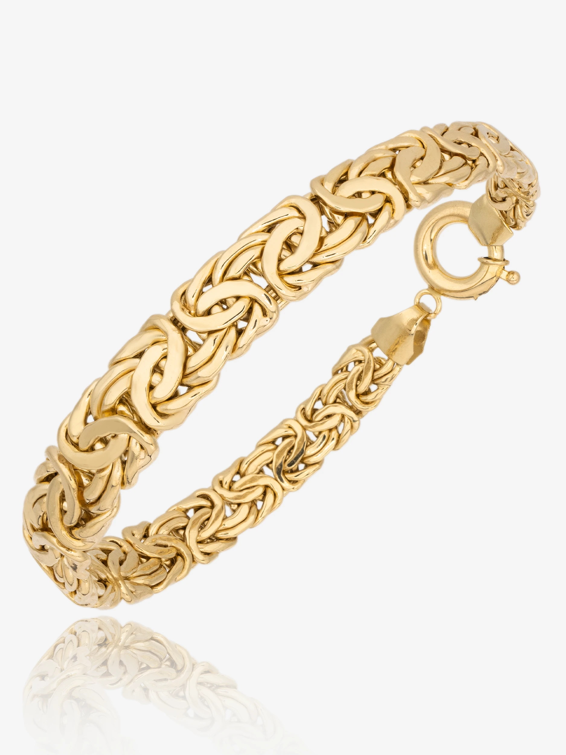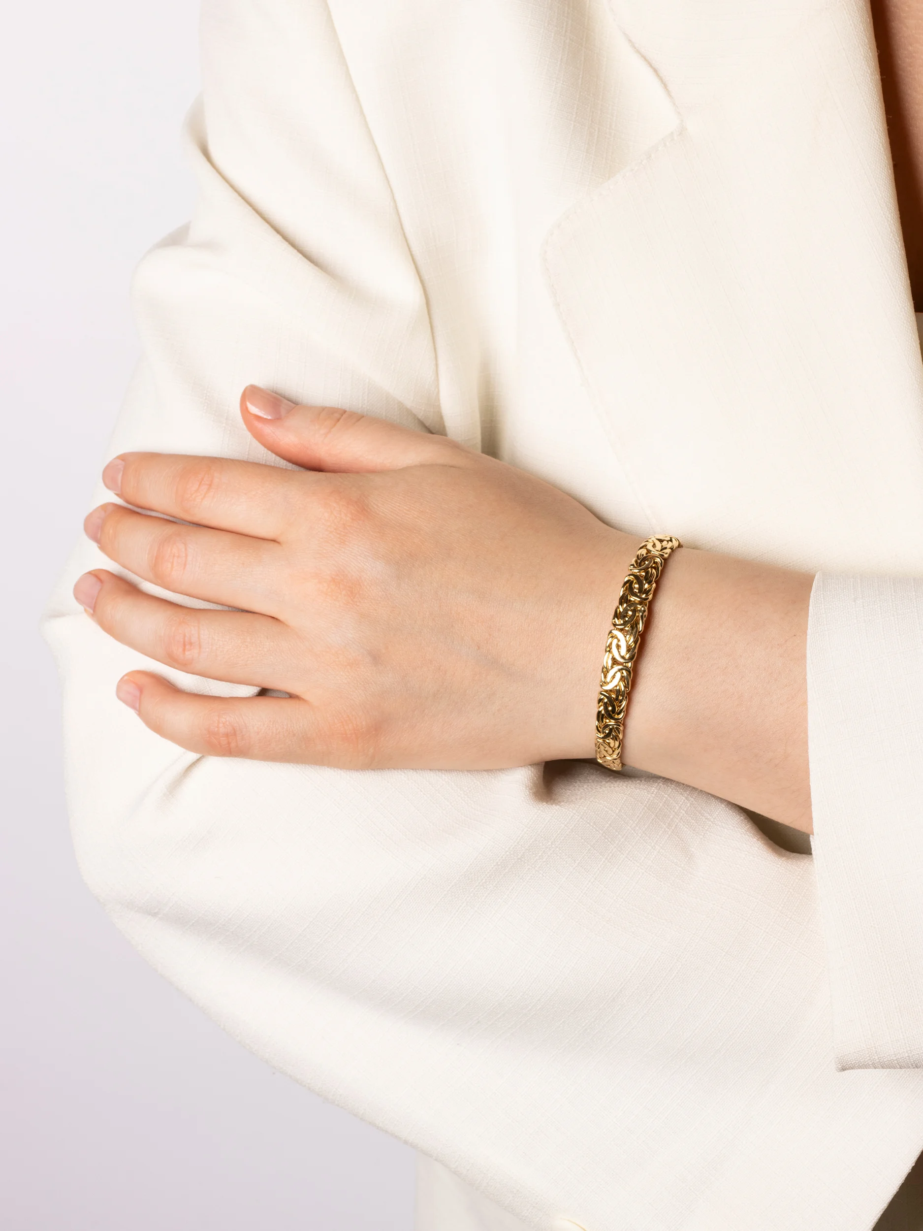 Klasyczna złota bransoletka w splocie królewskim (bizantyjskim), o płaskiej i zwężanej formie. Bransoletka płynnie zmienia szerokość od 9 mm w centralnym punkcie do 6 mm przy zapięciu.