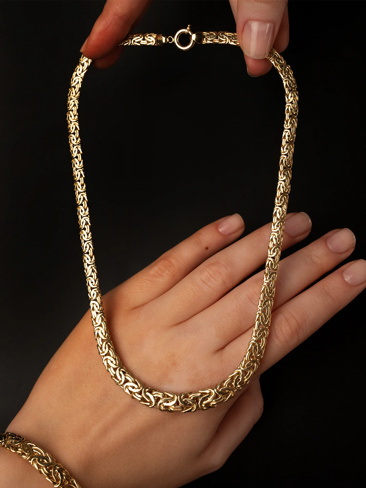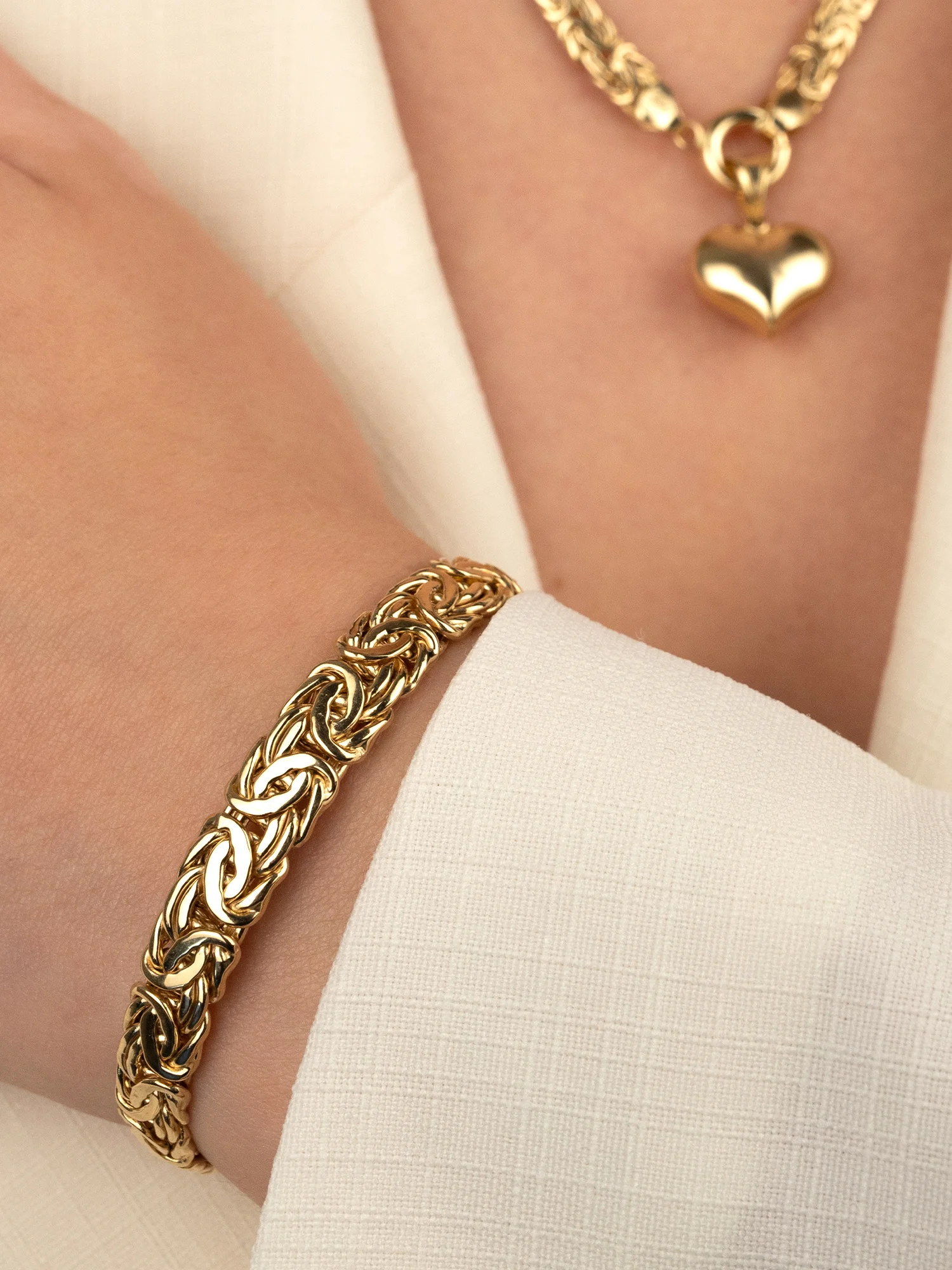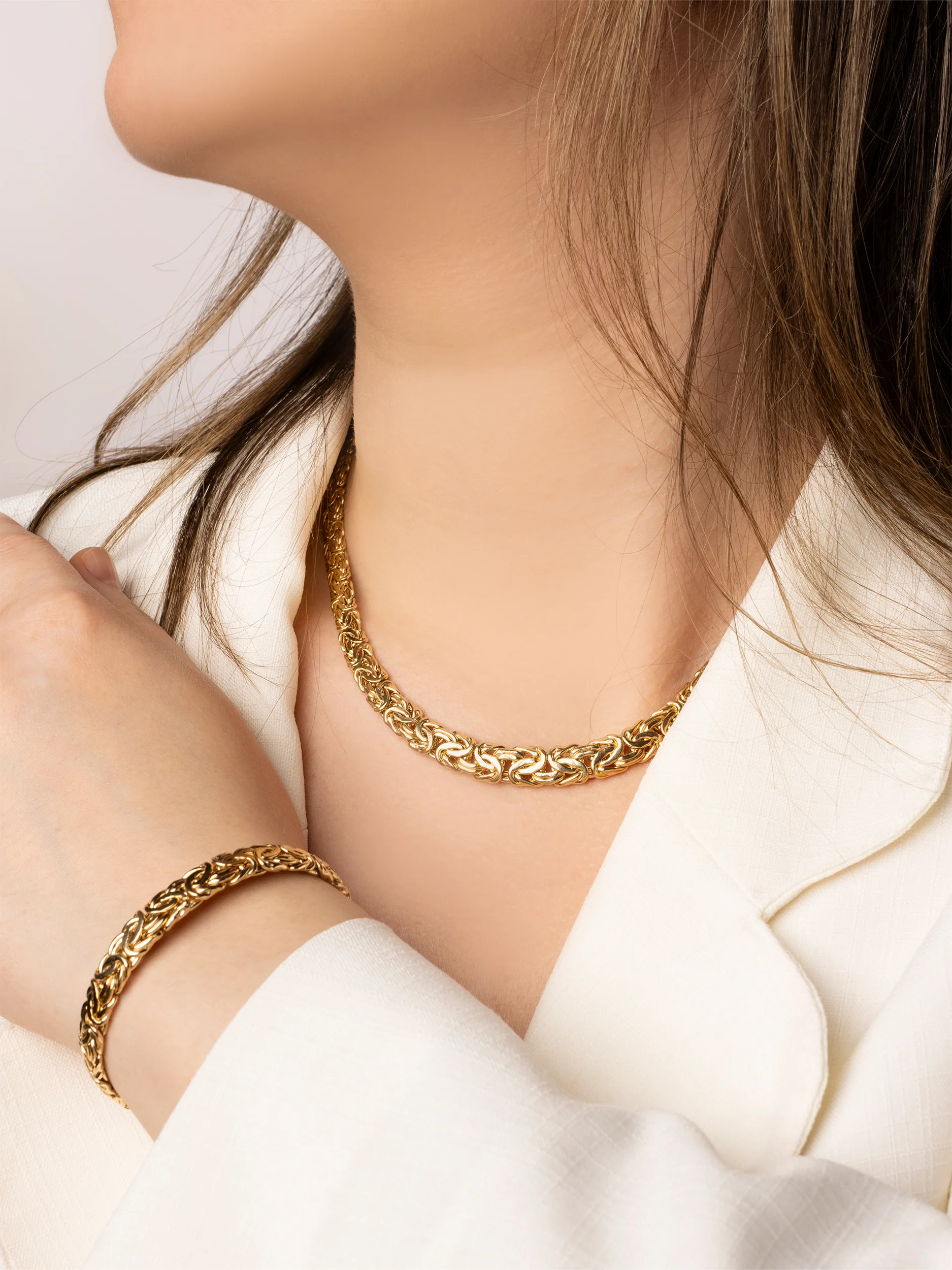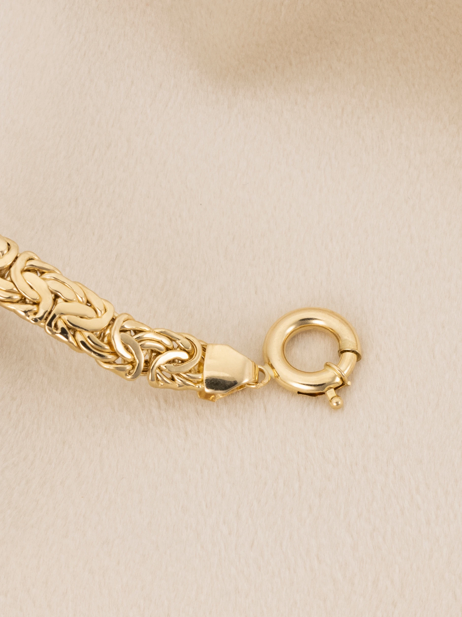 Klasyczna złota bransoletka w splocie królewskim (bizantyjskim), o płaskiej i zwężanej formie. Bransoletka płynnie zmienia szerokość od 9 mm w centralnym punkcie do 6 mm przy zapięciu.