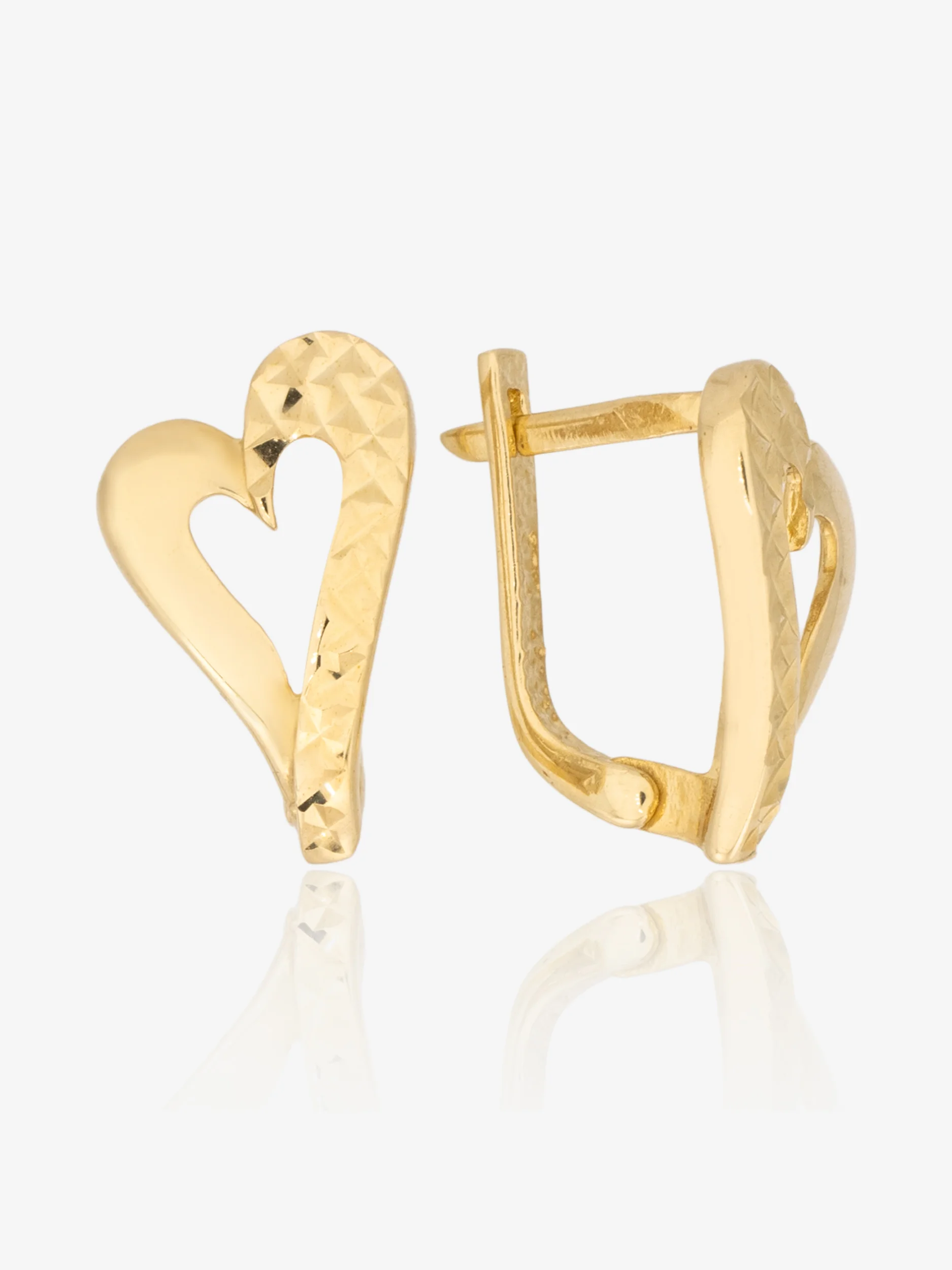 Złote kolczyki w kształcie serca o przestrzennej formie i diamentowanym wzorze. Wymiary serca to 10x16 mm. Zapięcie angielskie zapewnia wygodę i komfort noszenia. Wykonane w całości ze złota próby 585.