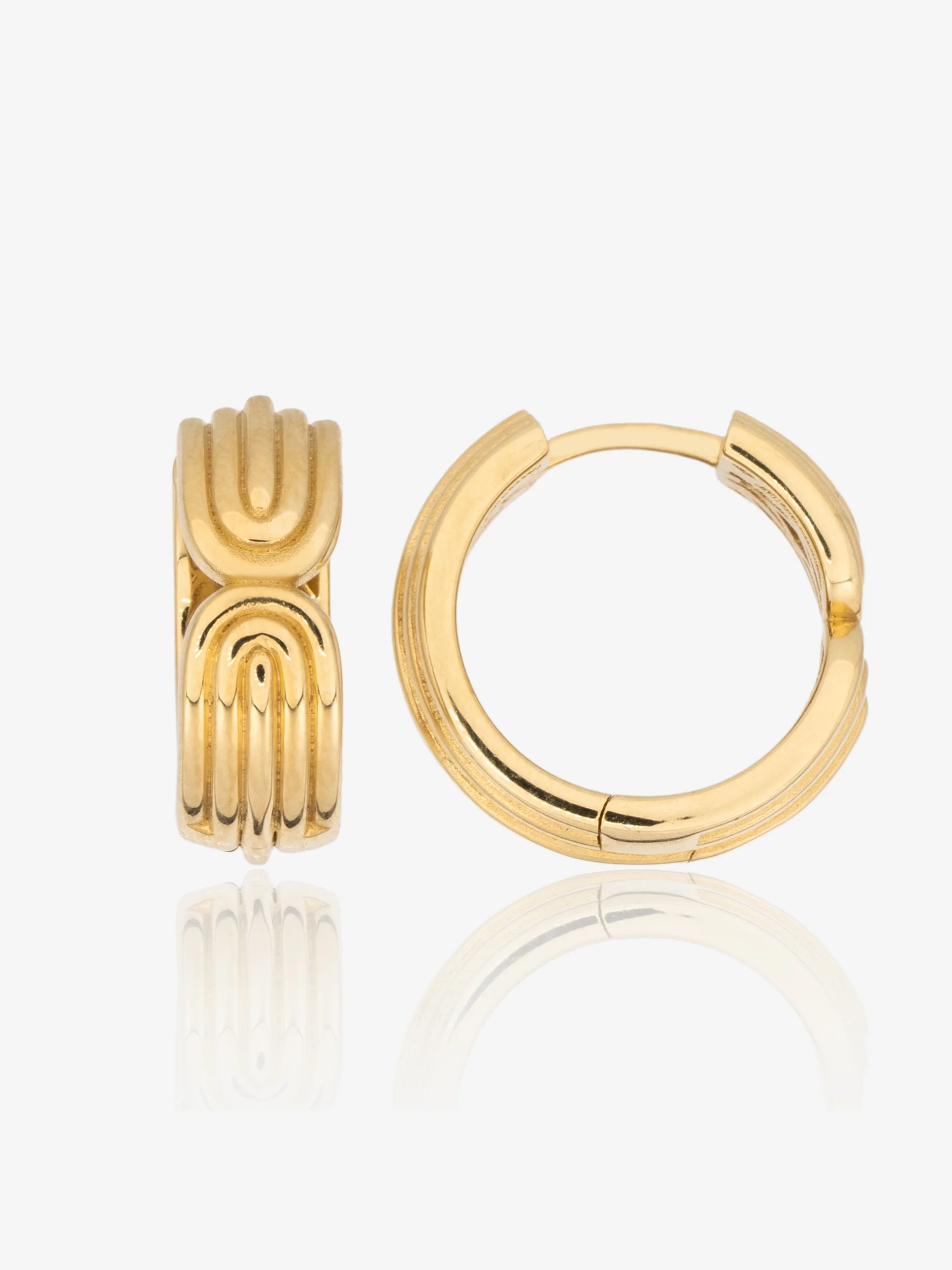 Grube, szerokie złote kolczyki koła z geometrycznym wzorem linii. Mają masywny wygląd i są wyjątkowo trwałe dzięki swojej wysokiej wadze. Średnica tych kolczyków wynosi 19 mm, ich szerokość 6 mm. Zapinane na solidny zatrzask, te kolczyki są nie tylko eleganckie ale również wygodne w noszeniu. Przyciągają wzrok podkreślając pewność siebie i wyczucie stylu. Wykonane w całości ze złota próby 585.
