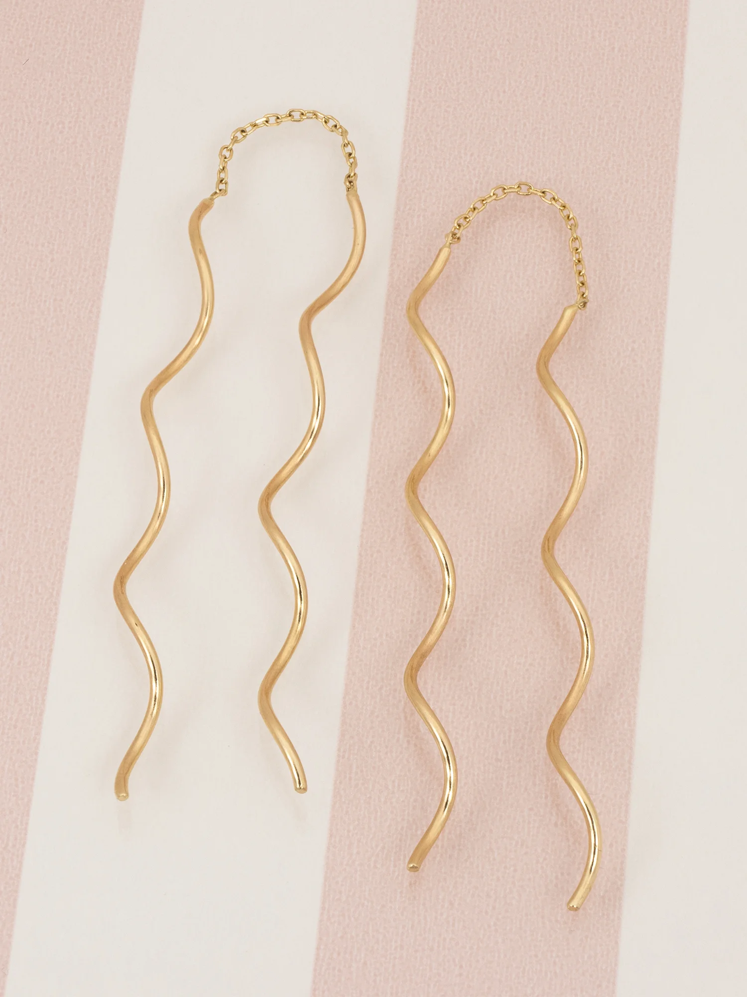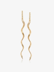 Subtelne i pełne lekkości – złote, przeciągane kolczyki w kształcie długich spiralek. To propozycja dla kobiet, które cenią nowoczesną biżuterię o minimalistycznym charakterze. Smukła linia układa się w delikatne fale, które pięknie poruszają się przy każdym ruchu, dodając całości zmysłowości i finezji. Niezykle lekkie i wygodne w noszeniu. Ich długość całkowita to 60 mm. Wykonane w całości ze złota próby 585.
