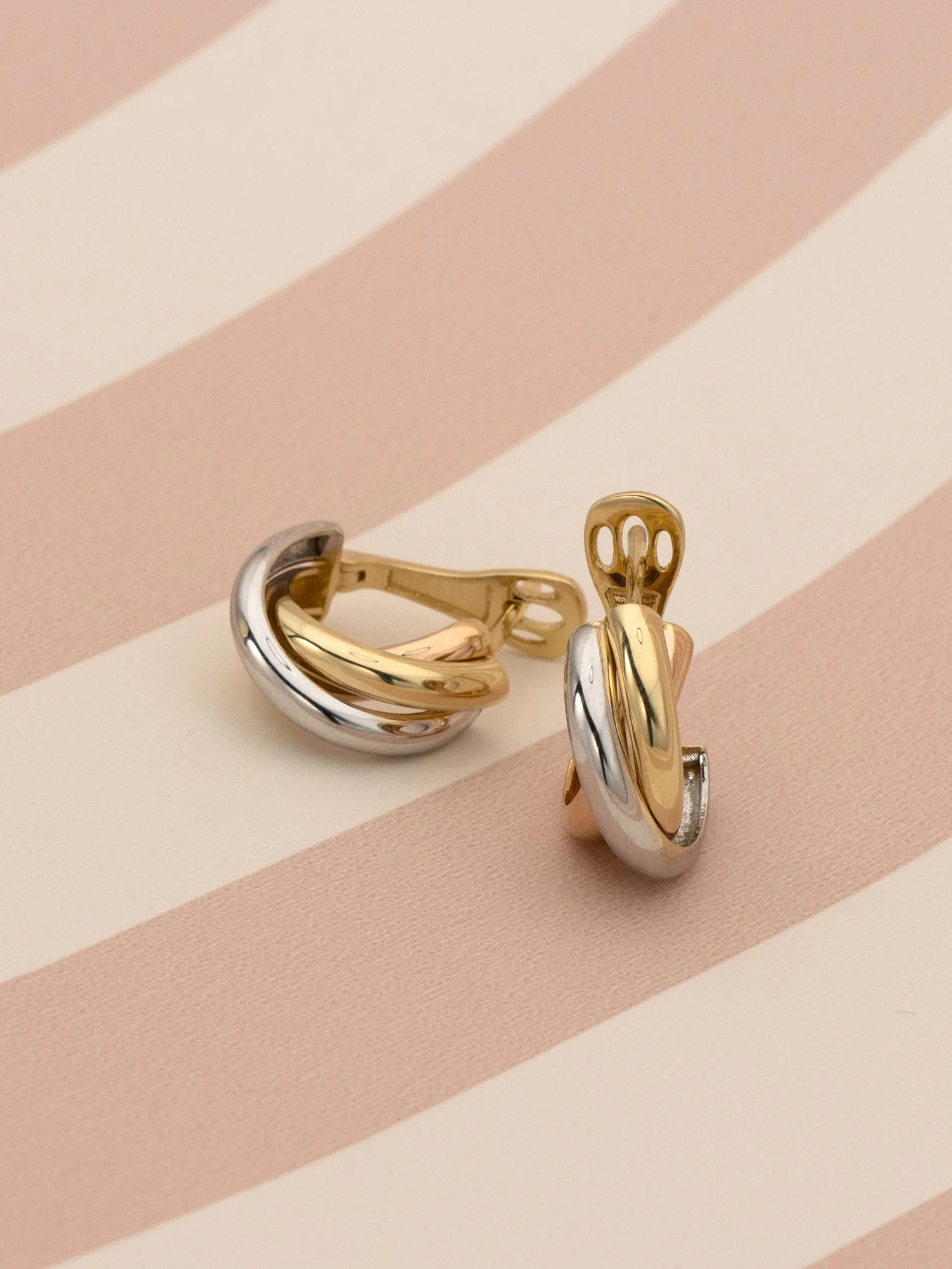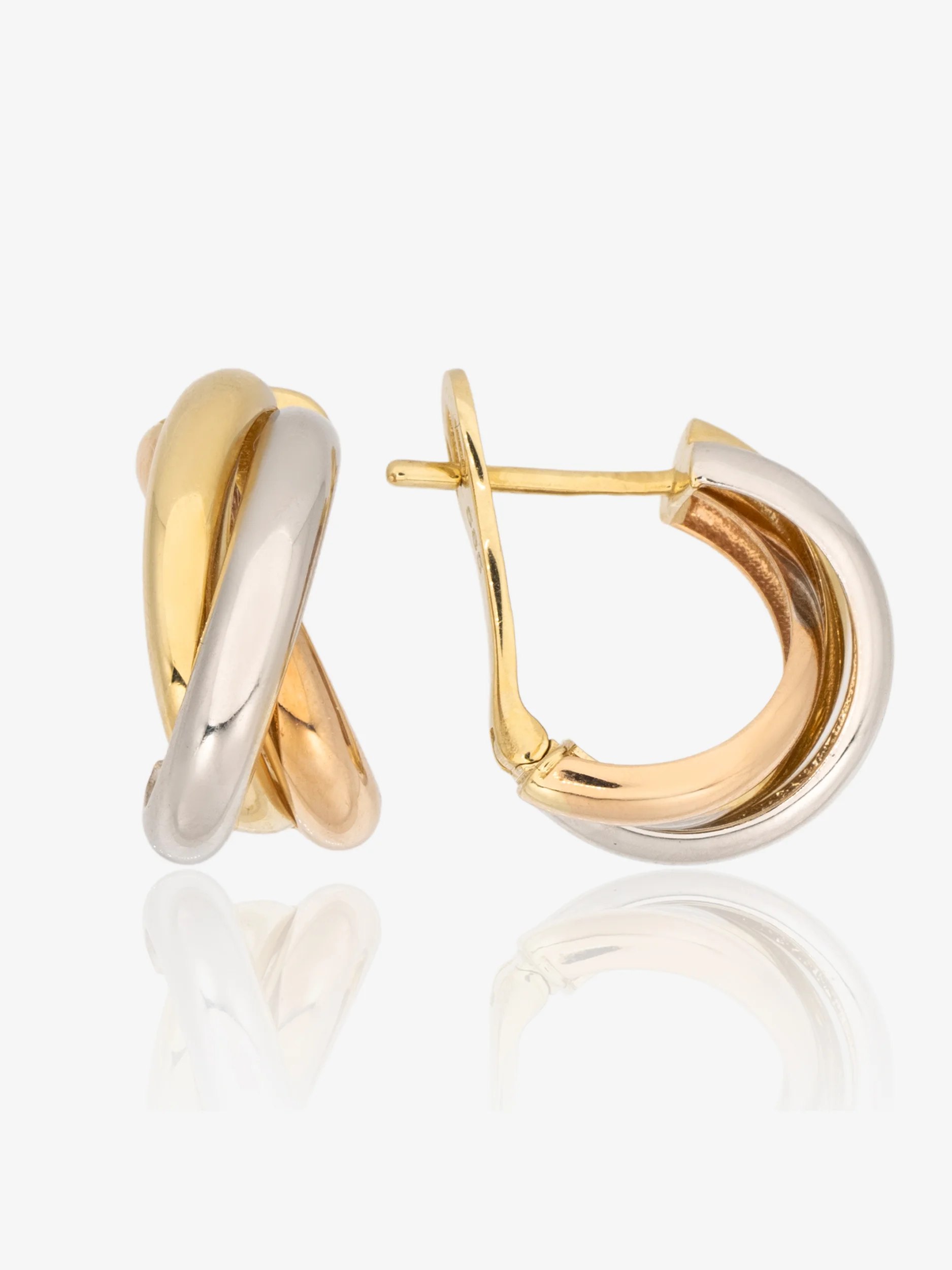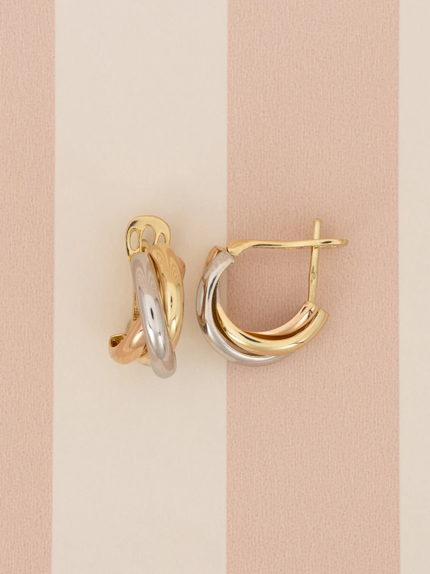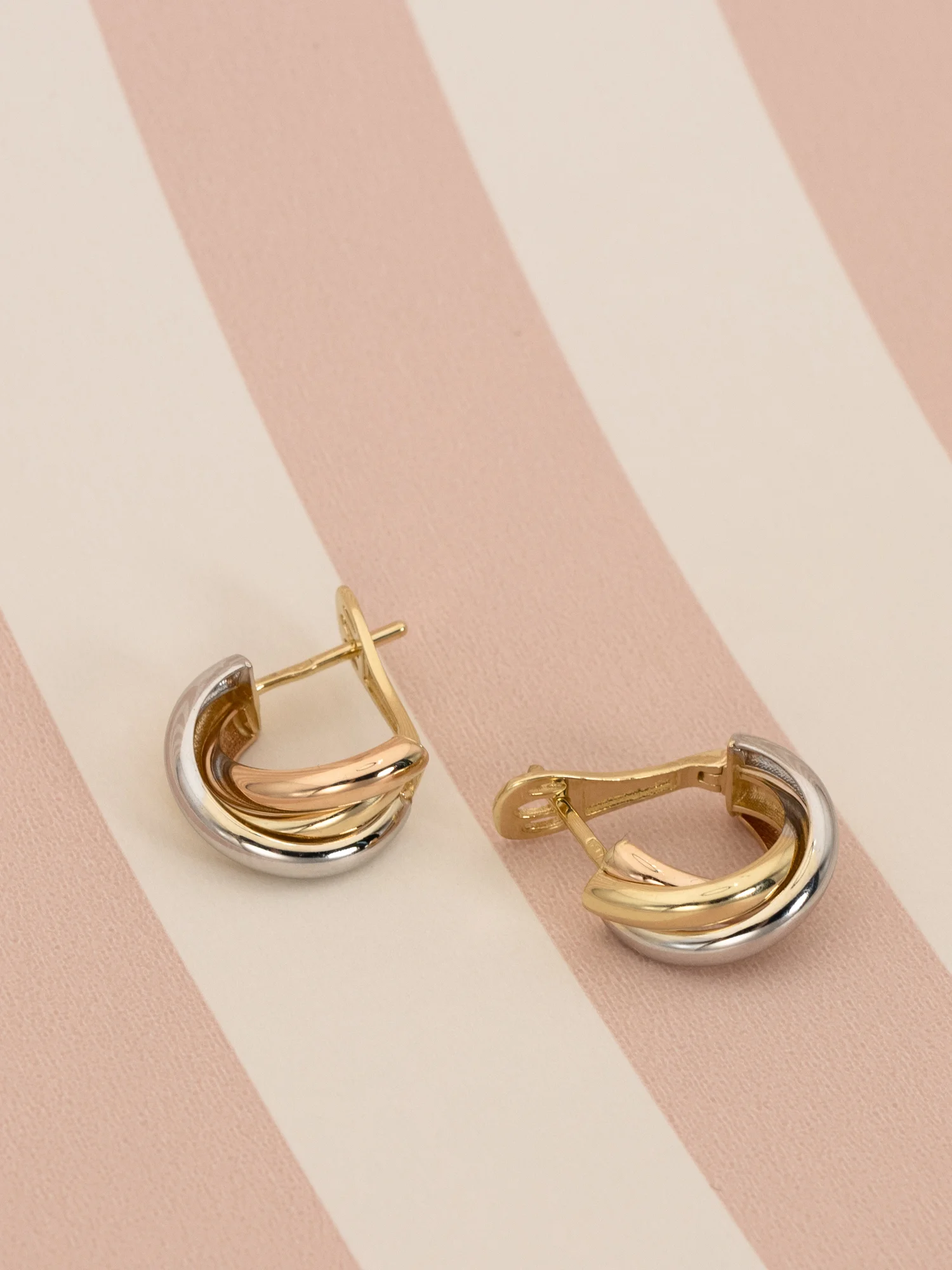 Złote kolczyki 585, przeplatane koła, złoto żółte, białe i różowe