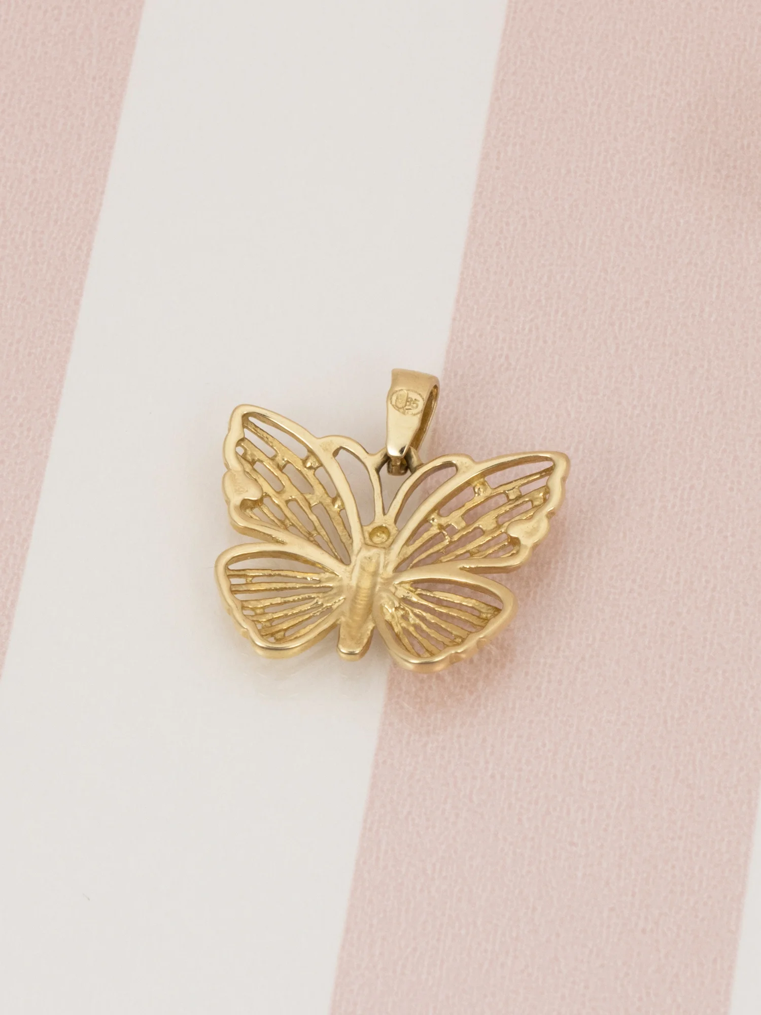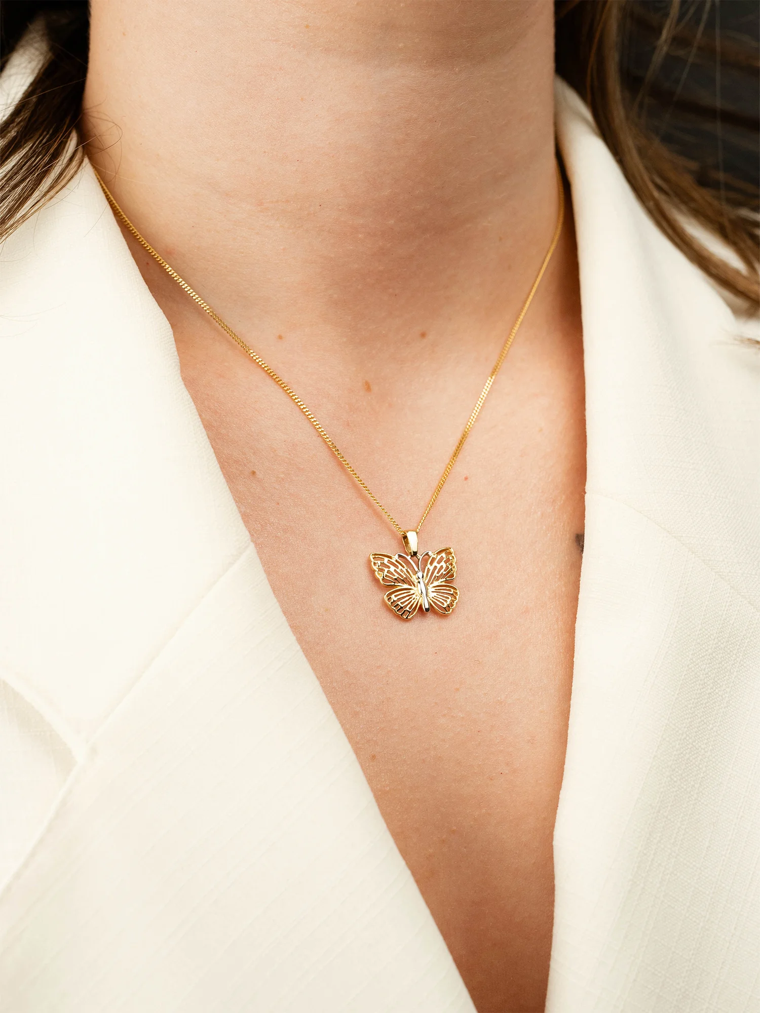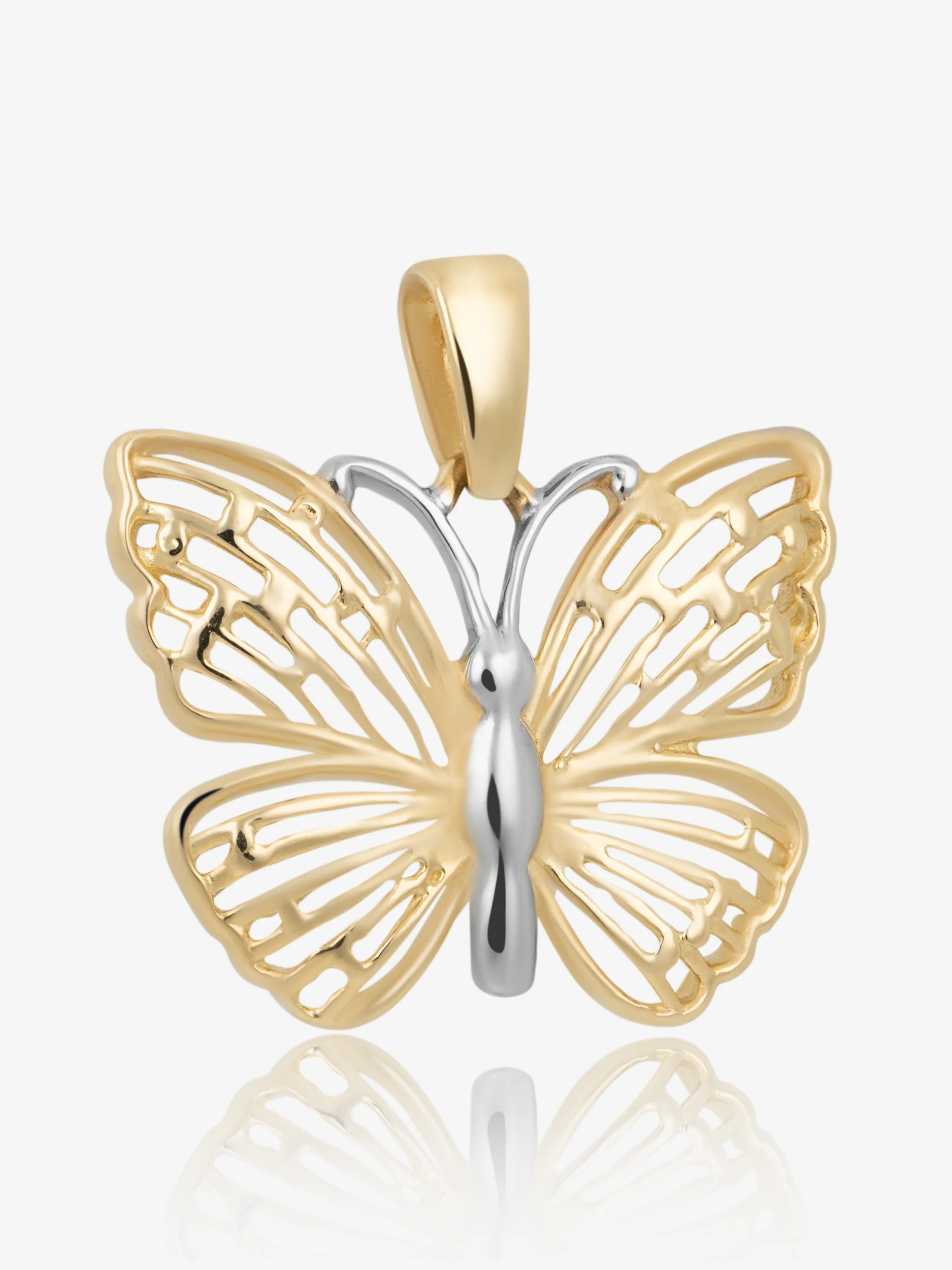 Złota zawieszka z motywem motyla z ażurowymi skrzydłami o wymiarach 3x20x16 mm. W centralnym punkcie zdobiona jest białym złotem, ażurowe skrzydła nadają jej lekkiej formy. Motyl to symbol przemiany, wolności i radości z życia – przypominający o pięknie chwil i sile zmian. Zawieszka wykonana w całości ze złota próby 585, będzie idealnie pasowała do łańcuszka o szerokości do 4 mm. Zobacz nasze złote łańcuszki do kompletu.