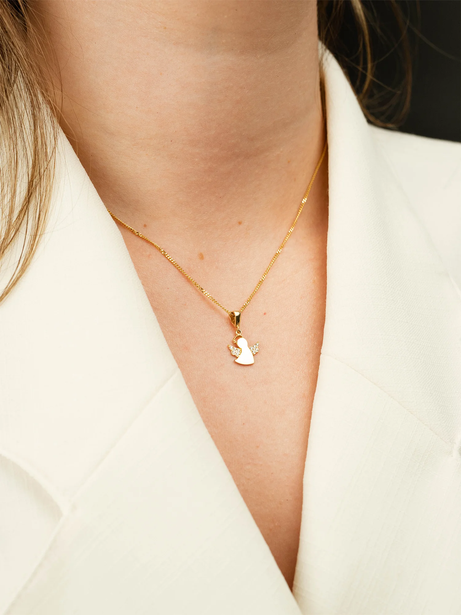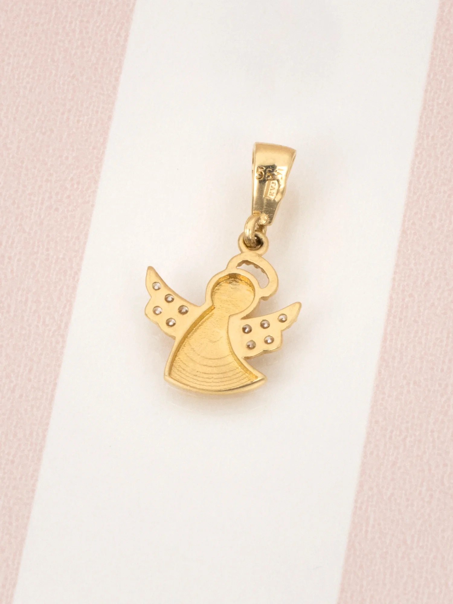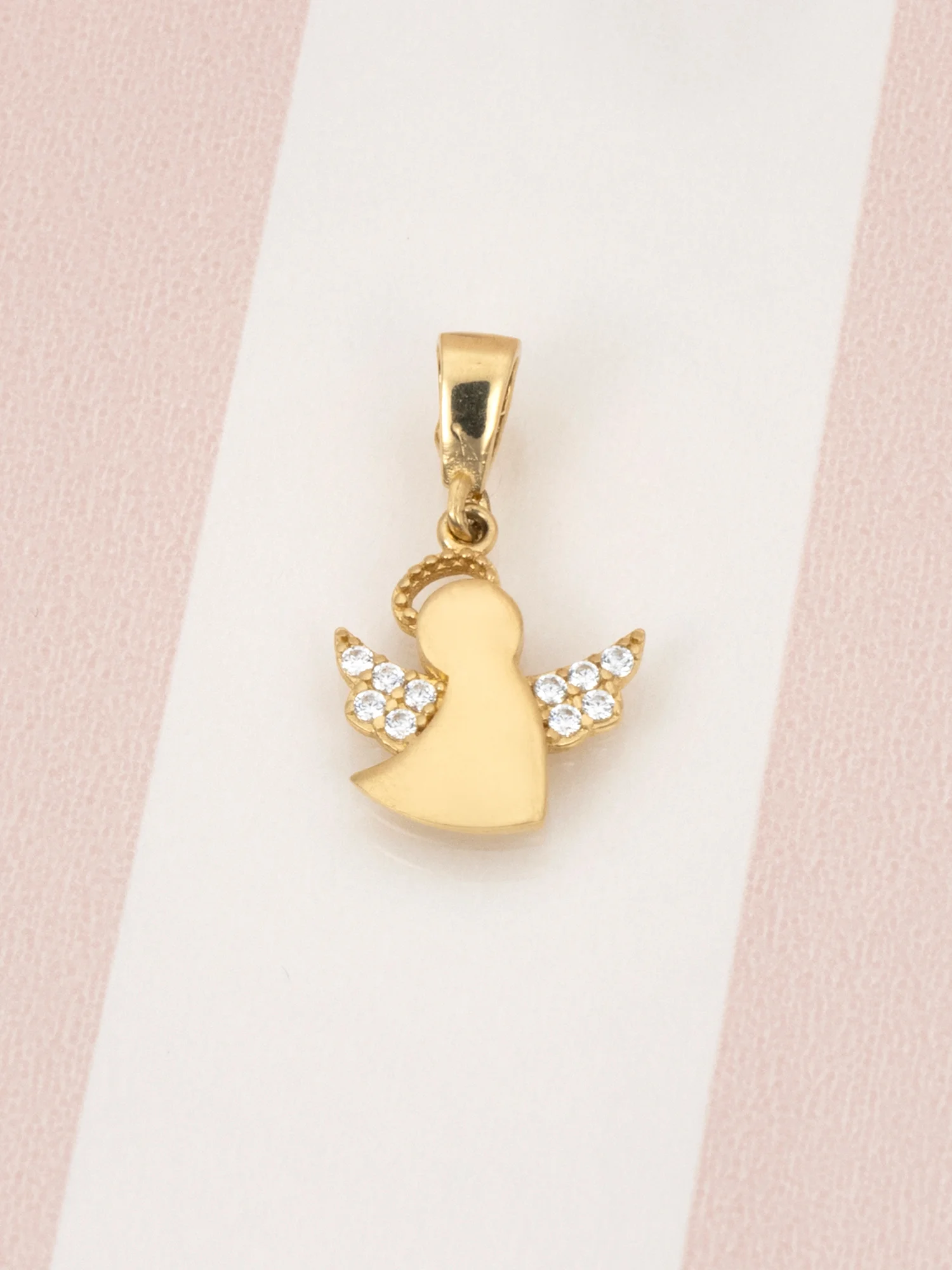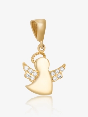 Złota zawieszka, wisiorek w kształcie anioła o wymiarach 11x13 mm. Jego skrzydła wysadzane są drobnymi cyrkoniami, które pięknie odbijają światło. Wykonana w całości ze złota próby 585. Idealny do łańcuszka o szerokości do 3 mm. Świetnie sprawdzi się jako prezent na chrzciny, komunię czy do noszenia na co dzień. Zobacz nasze złote łańcuszki do kompletu.