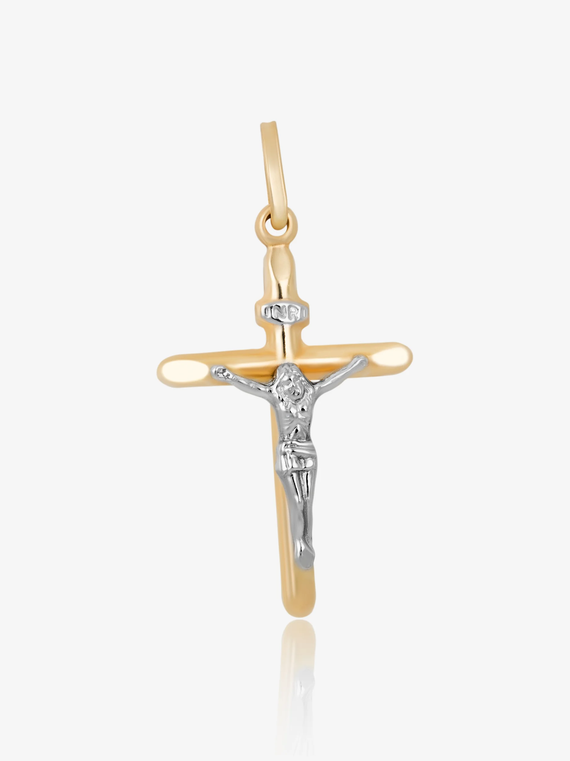 Złoty krzyżyk z wizerunkiem Jezusa Chrystusa o wymiarach 3x17x27 mm, idealny do łańcuszka o szerokości do 5 mm. Gładko wypolerowana zawieszka wykonana jest w całości ze złota próby 585. Centralna postać Jezusa oraz tabliczka INRI jest zdobiona białym złotem. Świetnie sprawdzi się jako prezent na chrzciny, komunię czy do noszenia na co dzień. Zobacz nasze złote łańcuszki do kompletu.