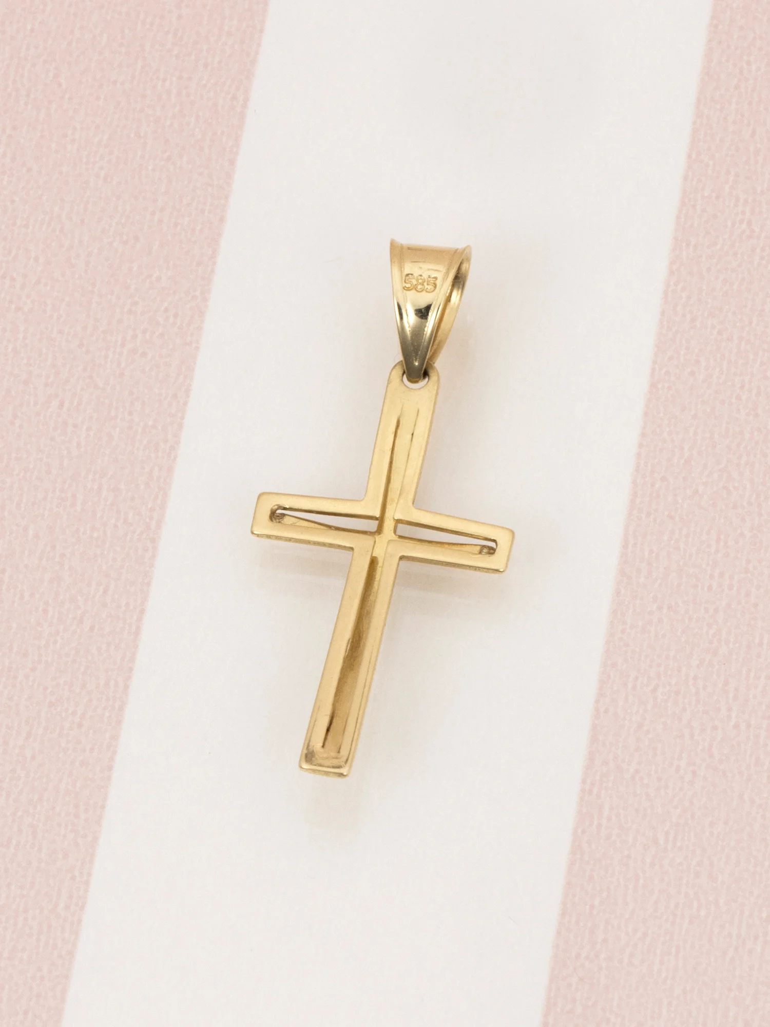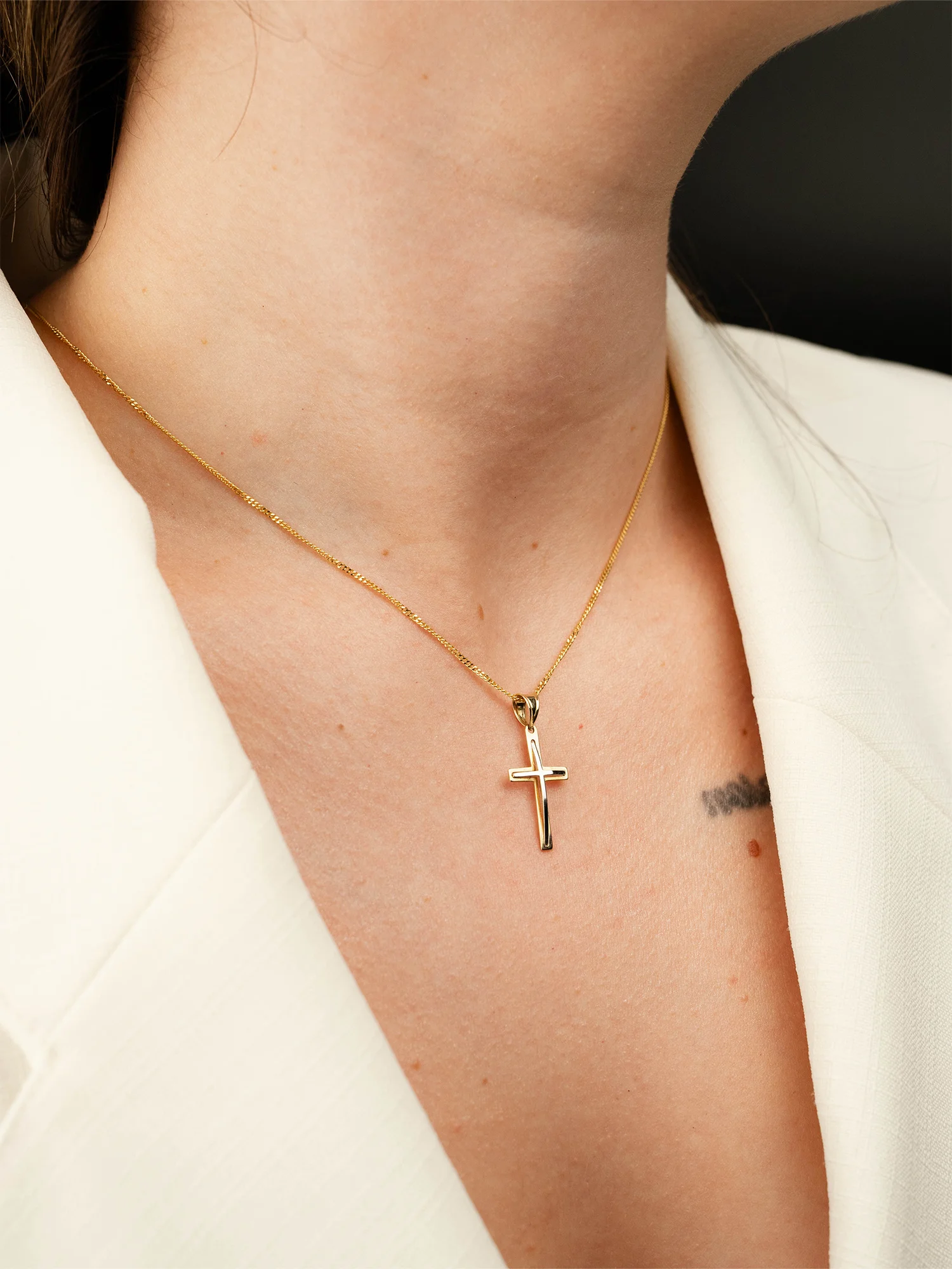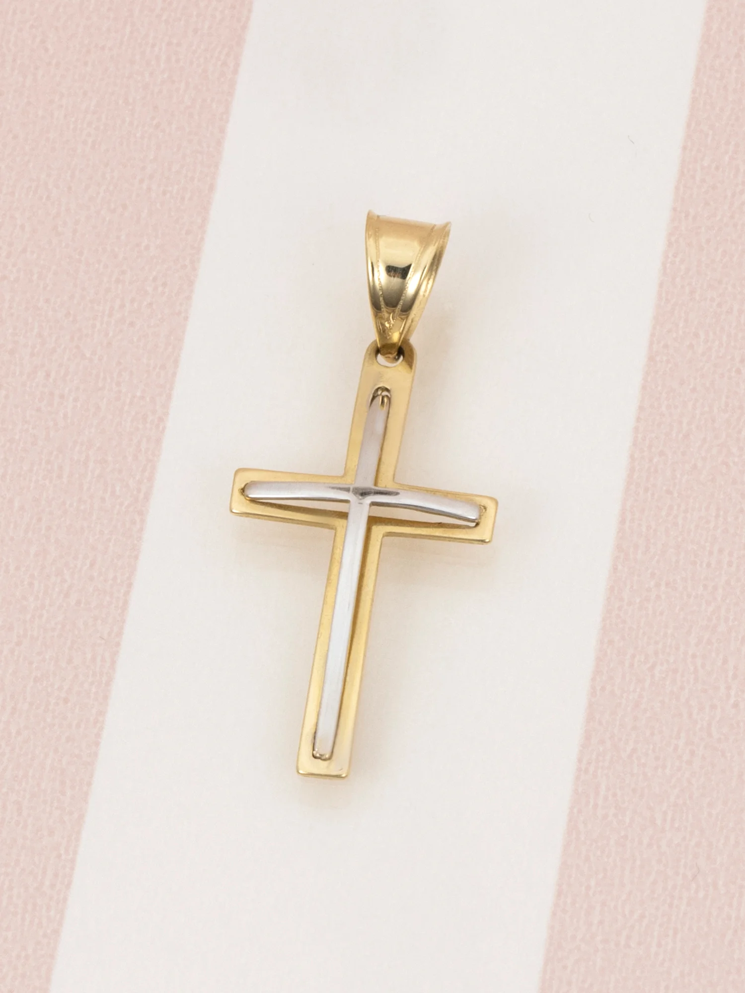 Złota zawieszka krzyżyk o wymiarach 2x12x24 mm, idealna do łańcuszka o szerokości do 5 mm. Centralny, wypukły krzyżyk zdobiony jest białym złotem. Wykonana w całości ze złota próby 585. Świetnie sprawdzi się jako prezent na chrzciny, komunię czy do noszenia na co dzień. Jeśli brakuje Ci łańcuszka – zobacz nasze złote łańcuszki do kompletu.